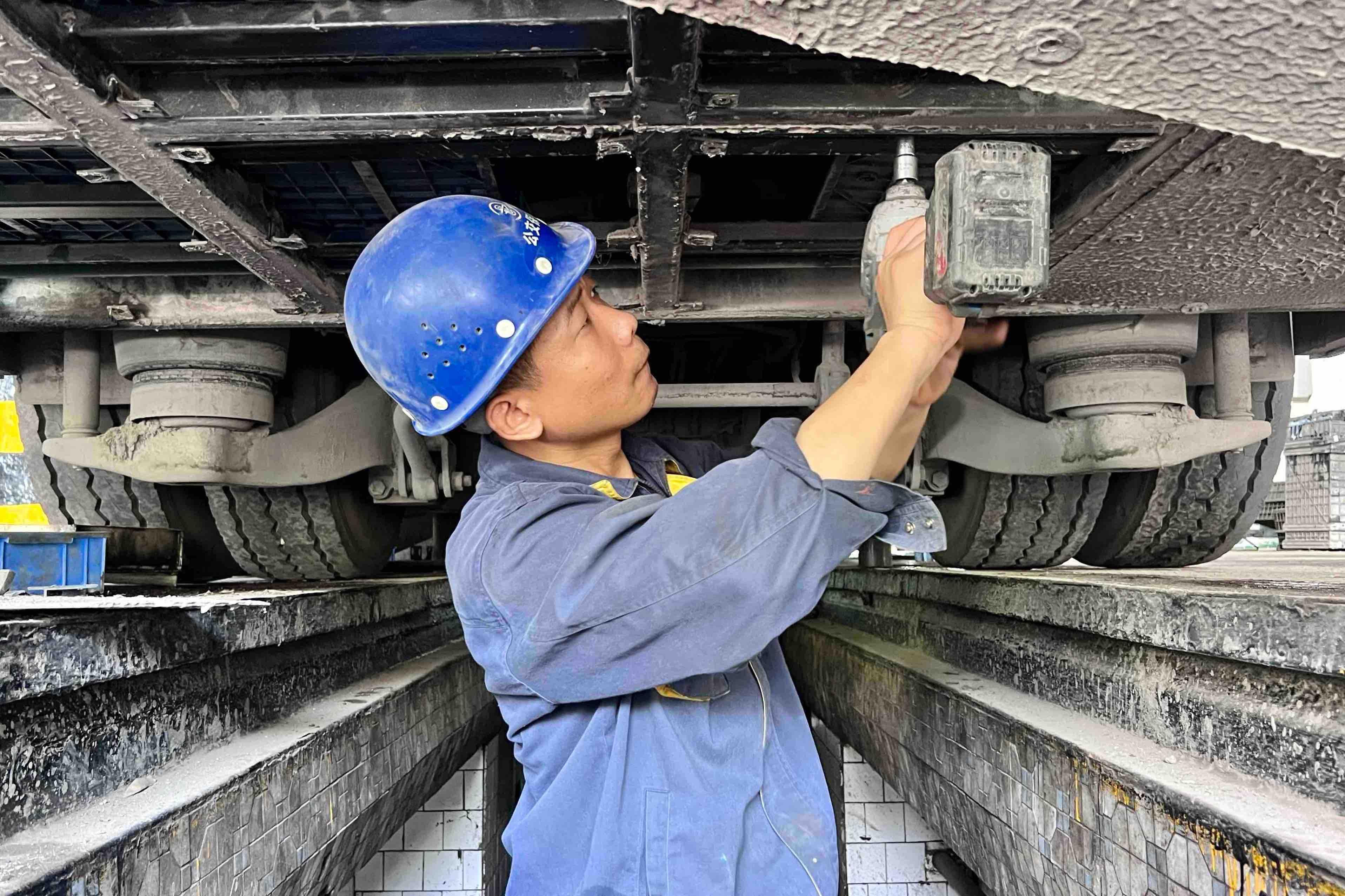 11时,日头正烈,修理工冯贝贝半蹲在狭窄空间内检修车辆底盘,地沟内残留的温度混着车间里的热气,在这方寸之地凝成一股闷热的气流,让人有些喘不过气。他安全帽的内衬已被汗水浸透,鬓角滑落的汗珠滴在工装裤上,洇出深色印记,又很快被体温烘干。“现在避开正午最晒的时段作业,比以前好多了。”换工具的间隙,冯贝贝直起身稍作歇息,端起一杯绿豆汤喝了几口说。