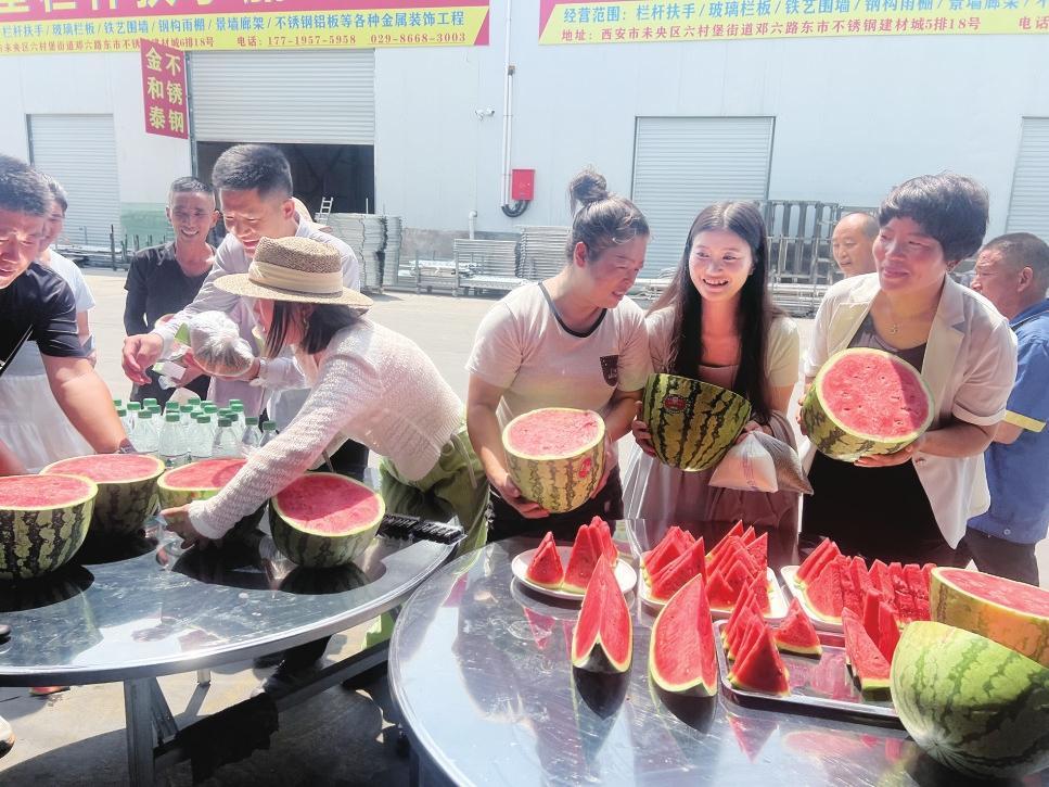 孟君玲介绍,除了设置“清凉补给站”和现场分发西瓜,市场还不定时巡逻,让商户们调整工作时间,避开高温峰值作业。“我们还在商户群里发了防暑小贴士,提醒大家多喝水、少暴晒,有任何不适随时联系我们。”孟君玲说,商户们安心经营,市场才能越来越好。