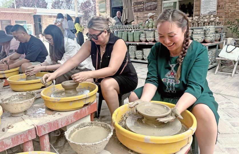 7月11日,“人权行动看中国·2025”中亚代表团走进铜川市印台区陈炉古镇,成员们在陶艺工坊体验拉坯过程。