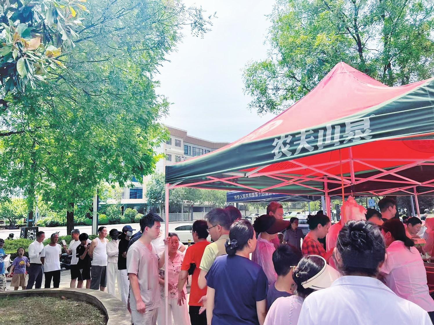 记者看到,有市民端着饭盒来“打饭”,有还没脱下工作服的工人蹲在路边就开始干饭,酒店经理看到后赶紧将他请进大厅:“以后您过来吃饭,就坐在大厅,大厅里有空调,还有绿豆汤,外面太热了。”