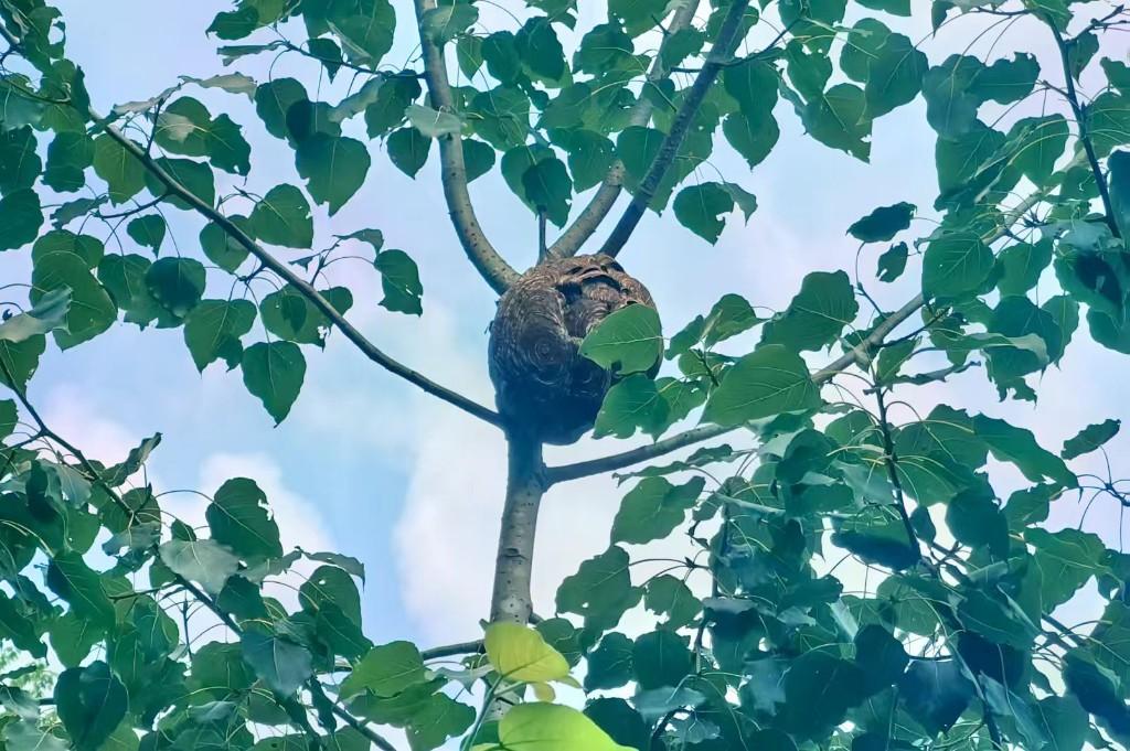 7月16日下午,家住安置点的郭先生拨通了桂山村支部书记的电话:“张书记您好,我在三组任双德老家下面的公路往里10米处,发现有两个篮球大的胡蜂窝,过往行人不敢靠近,麻烦你们来看看!”接到电话后,支部书记张以富和监委会主任带着防蜂服、杀虫剂、伸缩梯等装备迅速赶到现场。此时户外温度已达38℃,在阳光直射下,防蜂服表面温度接近50℃,穿上装备的瞬间,他们便已汗流浃背。