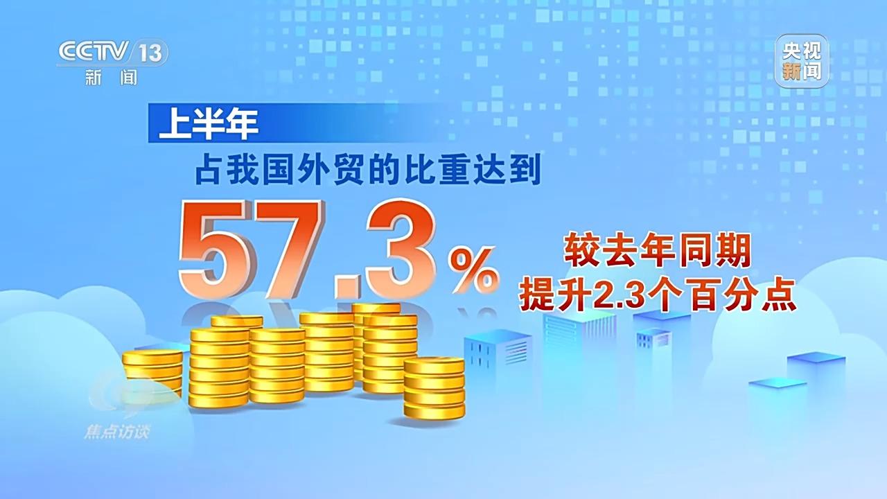 回顾上半年中国经济所遭遇的种种挑战,无疑是经历了一轮高强度的压力测试,外贸领域首当其冲。面对关税战等外部压力,今年上半年中国货物贸易进出口21.79万亿元人民币,同比增长2.9%,仍创下历史同期新高,其中民营企业扮演了关键角色,上半年民营企业进出口12.48万亿元,同比增长7.3%,占我国外贸的比重达到了57.3%,较去年同期提升了2.3个百分点,进出口规模历史同期首次突破12万亿元。