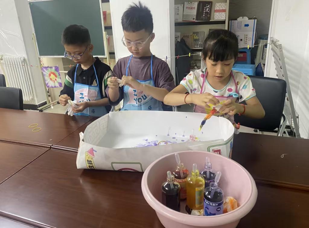 最令人期待的是非遗扎染课。当社区工作人员展示出五彩相间的扎染手帕时,孩子们立刻被那变幻莫测的花纹吸引。“这是怎么做到的?”带着好奇,孩子们学着用皮筋将白布扎出蝴蝶结、小揪揪,再浸入靛蓝色的染料中。等待的过程格外漫长,拆布的瞬间却充满惊喜:有的手帕像洒满星星的夜空,有的像层层叠叠的水波,还有的像绽放的花朵。“我的图案独一无二!”孩子们互相展示着作品,在色彩晕染的奇妙中,感受着传统工艺“三分人工,七分天成”的智慧。