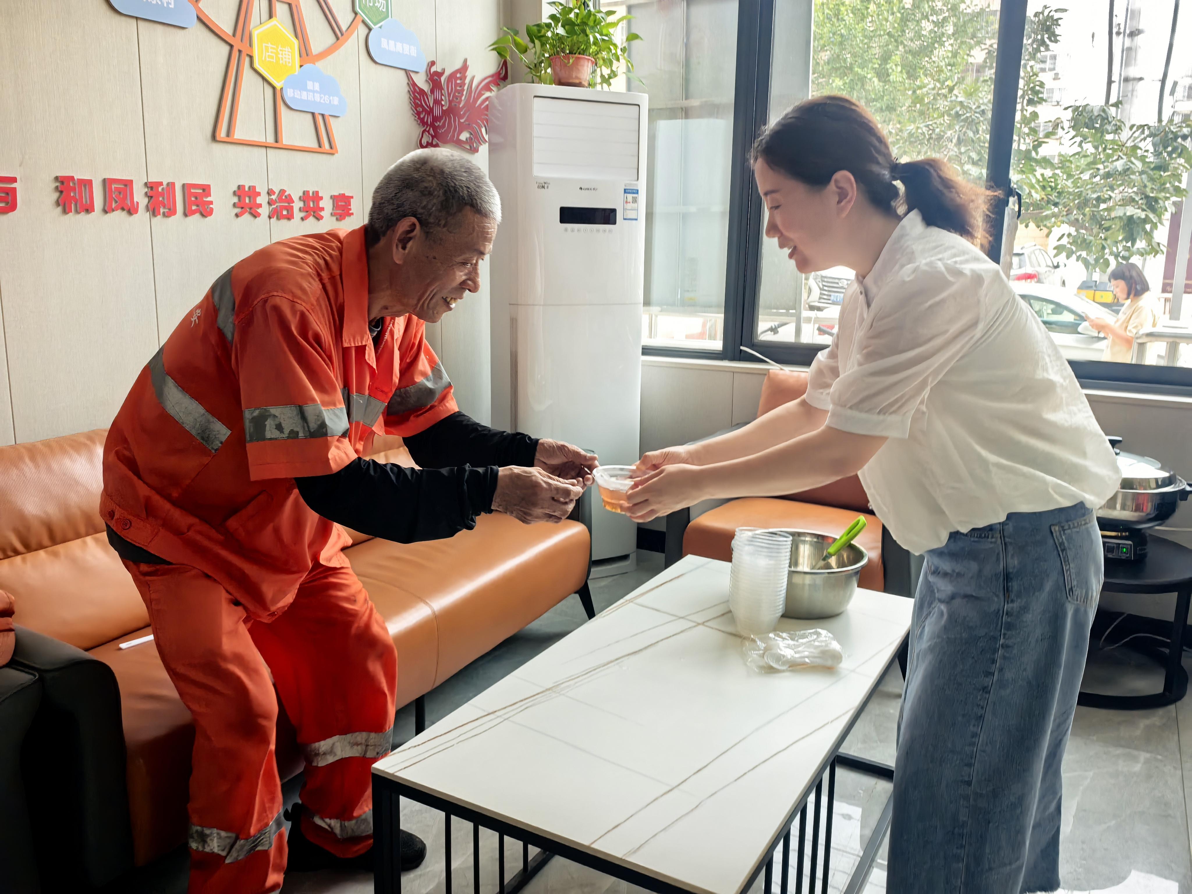 7月18日上午,西安市阎良区凤凰路街道凤凰街社区党群服务中心内,67岁的环卫工人刘新印正坐在社区爱心驿站区域小憩。旁边有一大锅熬好的绿豆汤,他接过工作人员递来的一碗绿豆汤,喝了一大口。“热了能来这儿歇脚,社区想得真周到。”他擦拭着额头上的汗水笑着说。