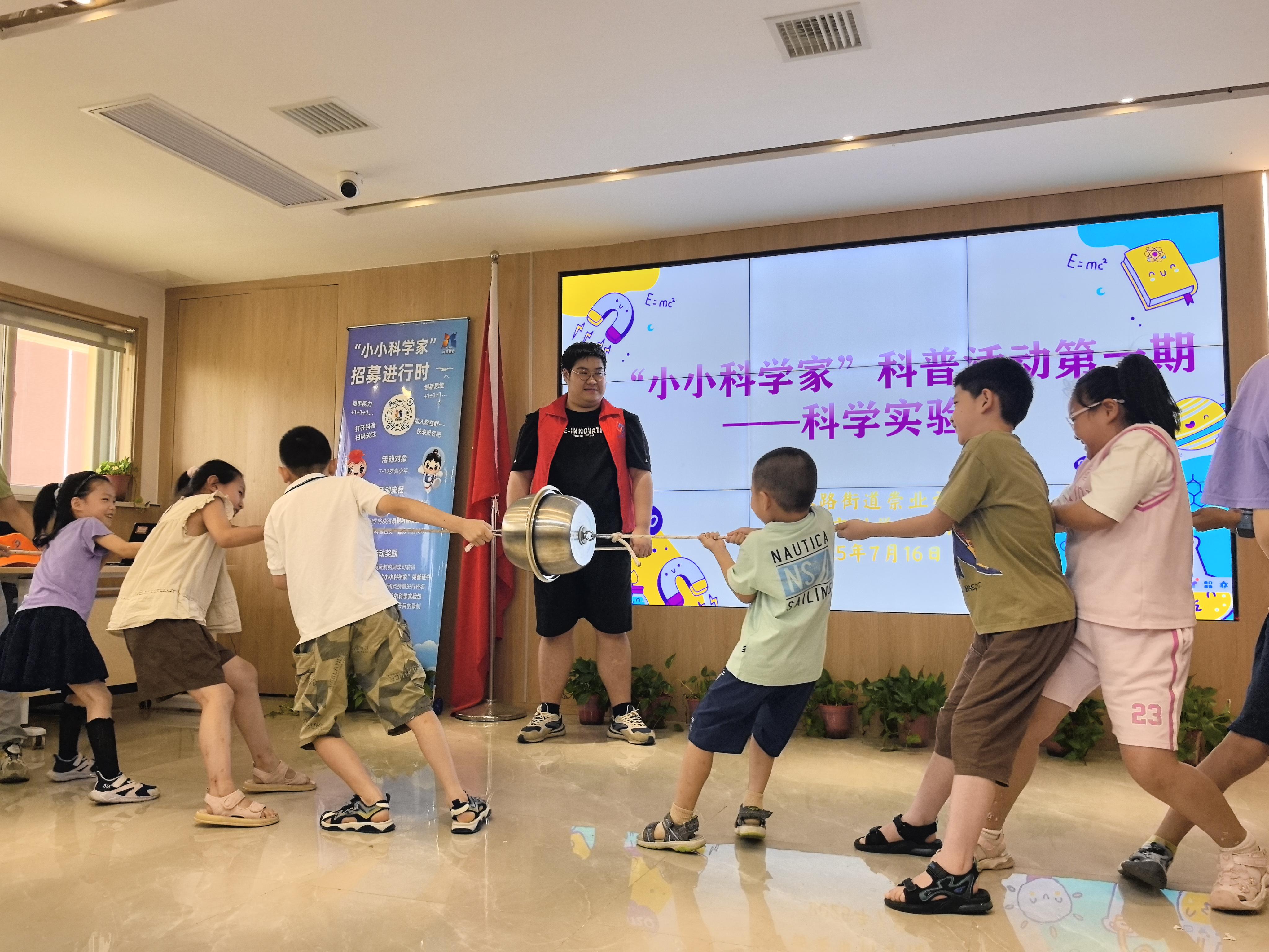 来到三楼,中小学生暑期托管班内传来阵阵加油声,这里正在开展“小小科学家”主题活动。孩子们分成两队,使出浑身解数也拉不开抽成真空的马德堡半球。