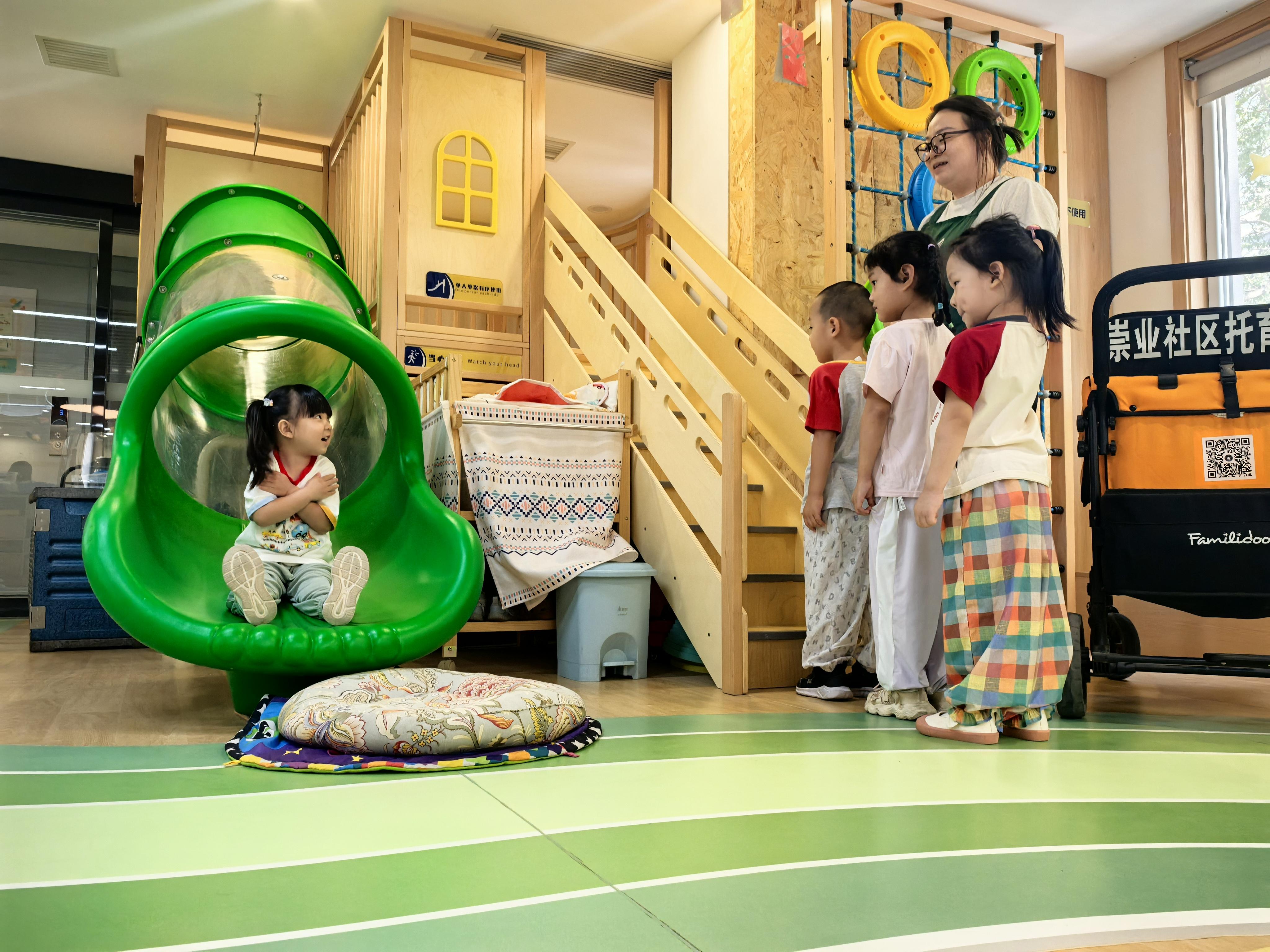 记者看到,约290平方米的空间被划分为哺乳区、活动区和睡眠区等区域。在老师的陪伴下,十几名幼儿有的在绘本区安静阅读,有的在游戏区专注地搭积木,有的在玩滑滑梯。临近中午,孩子们围坐在一起用餐。