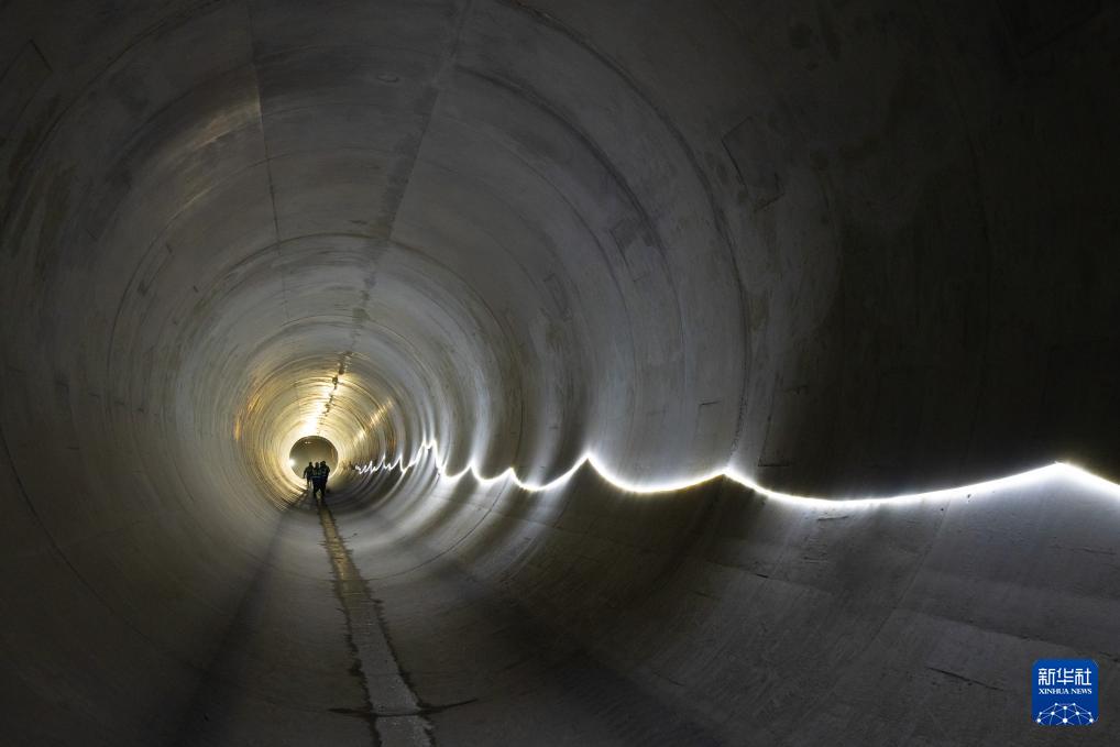 7月6日,在位于莱索托东部的莫霍特隆地区,施工人员在波利哈利输水隧洞建设项目进水口管道内巡查。新华社记者 杨光 摄