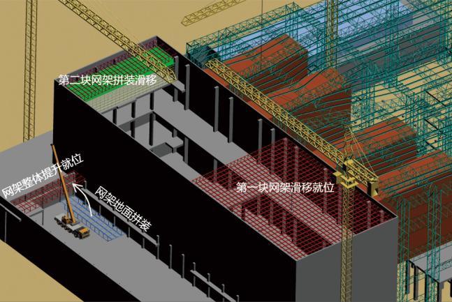 施工过程中,面对垃圾间和焚烧间网架安装难度大、吊装高度高等问题,项目团队通过BIM技术进行模拟组拼,现场进行分段拼接,采用拼接滑移法安装,即增加了施工过程中安全性,又有效提高了施工效率和安装质量。