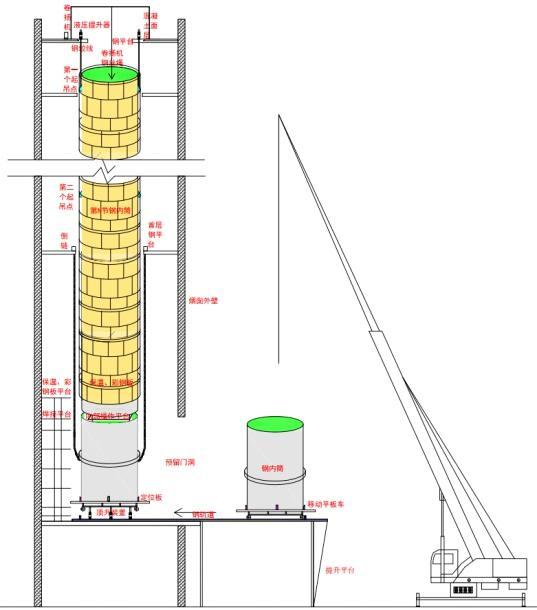 为保证烟囱筒体垂直度和混凝土施工质量,外筒施工采用液压提升滑模施工技术,内筒安装采用液压提升倒装施工技术,同时通过深化设置液压提升、操作平台、垂直运输和翻模技术相结合的整体液压提升翻模技术,提高施工速度,降低了安全风险。