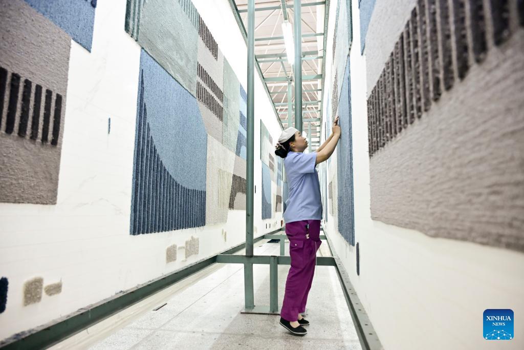 An employee checks a tool for the production of Tibetan carpet at a workshop of Shengyuan carpet group in Xining, northwest China's Qinghai Province, July 21, 2025. Located in Chengzhong District of Xining City, Shengyuan carpet group is an enterprise specializing in the design and production of Tibetan carpets. Since its establishment in 2007, the company has recruited people from surrounding areas, with 90% of its employees coming from nearby villages and including various ethnic minorities such as Tibetan and Tu ethnic groups.