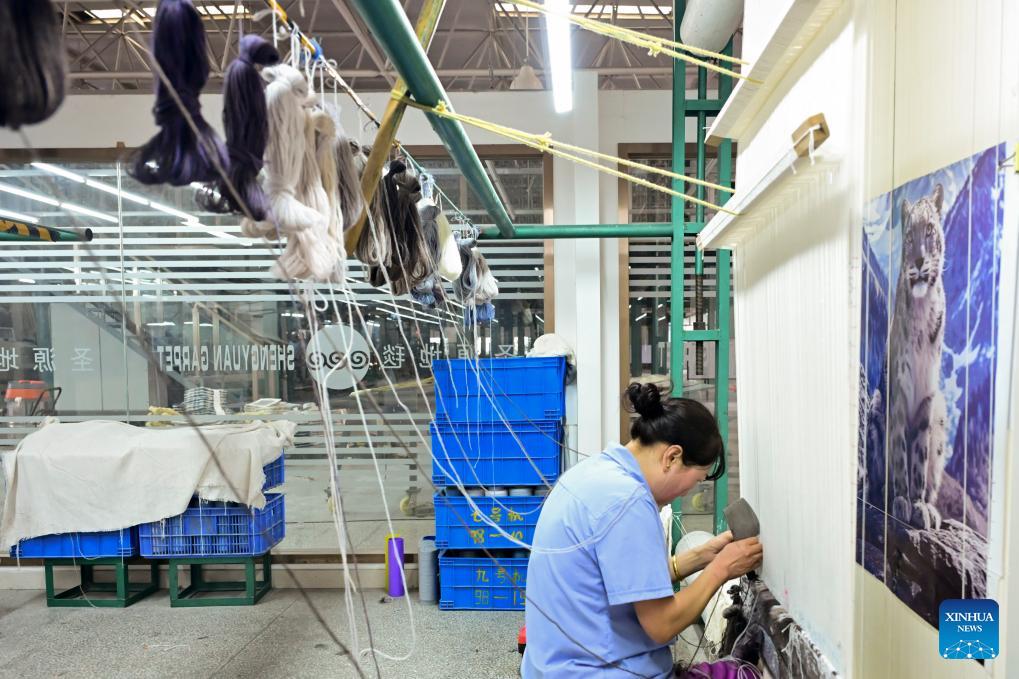 An employee sorts yarns at a workshop of Shengyuan carpet group in Xining, northwest China's Qinghai Province, July 21, 2025. Located in Chengzhong District of Xining City, Shengyuan carpet group is an enterprise specializing in the design and production of Tibetan carpets. Since its establishment in 2007, the company has recruited people from surrounding areas, with 90% of its employees coming from nearby villages and including various ethnic minorities such as Tibetan and Tu ethnic groups.