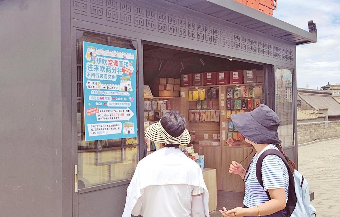 7月24日14时许,记者从永宁门登上城墙,往西约400米便看到了这家文创小店。门口的广告牌最上方用醒目的大字写着“想吹空调直接进来吹两分钟,不用假装看文创”。