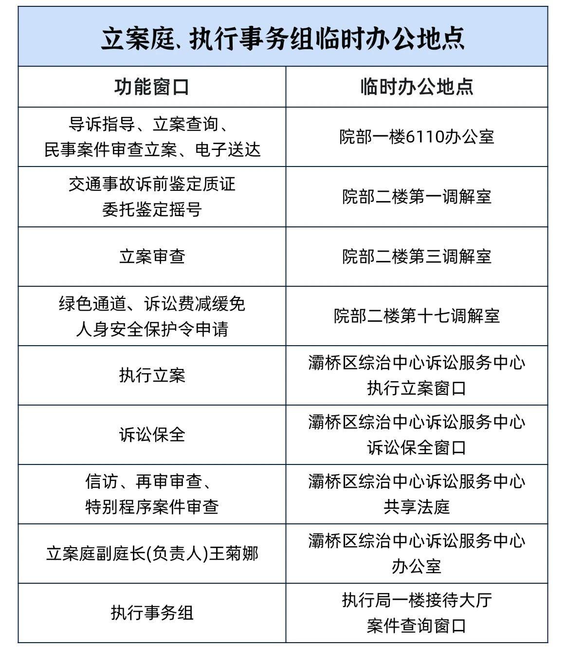三秦都市报-三秦网讯(记者 文晨)7月28日,西安市灞桥区人民法院传来消息,因灞桥法院诉讼服务中心进行施工改造,即日起,灞桥法院诉讼服务中心及其他业务部门办公场所进行调整。其中,诉讼服务中心所有办公业务,包括立案庭、速裁庭、执行事务组搬迁至灞桥法院本部、执行局及灞桥区综治中心(详情见图)。修缮结束后,诉讼服务中心将恢复正常办公,具体回迁时间另行公告。