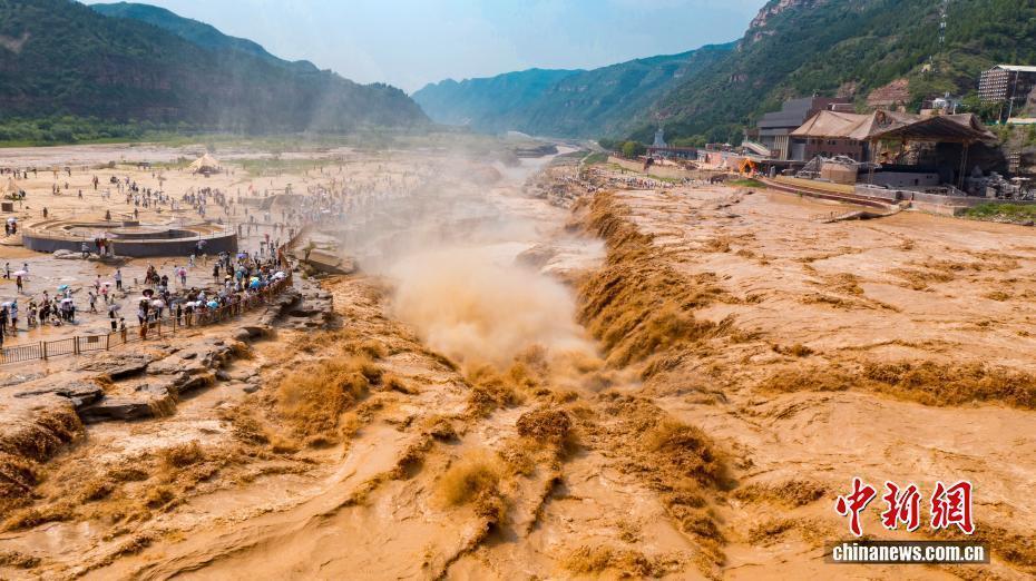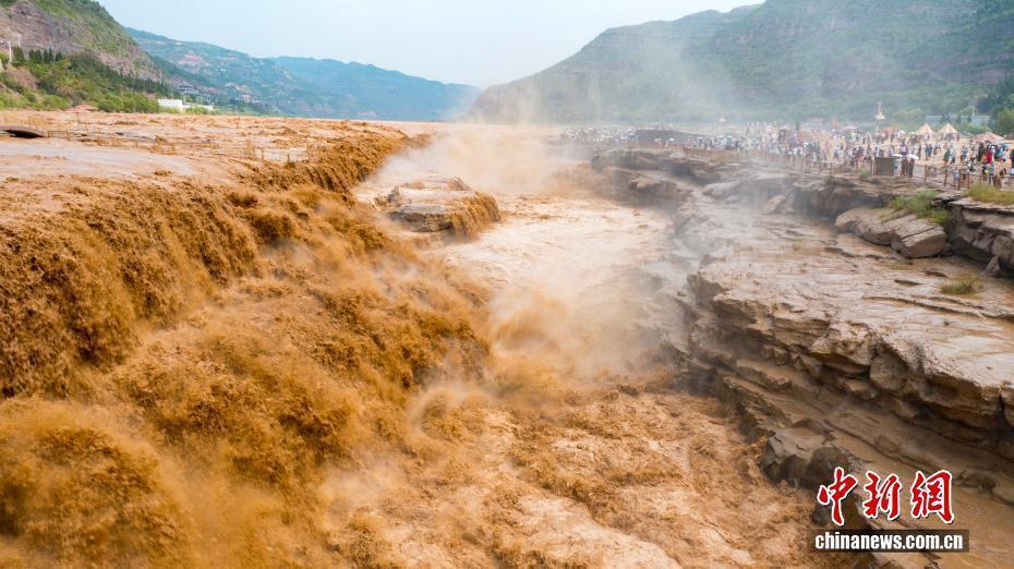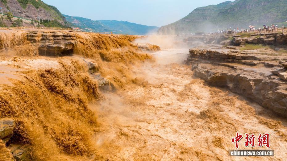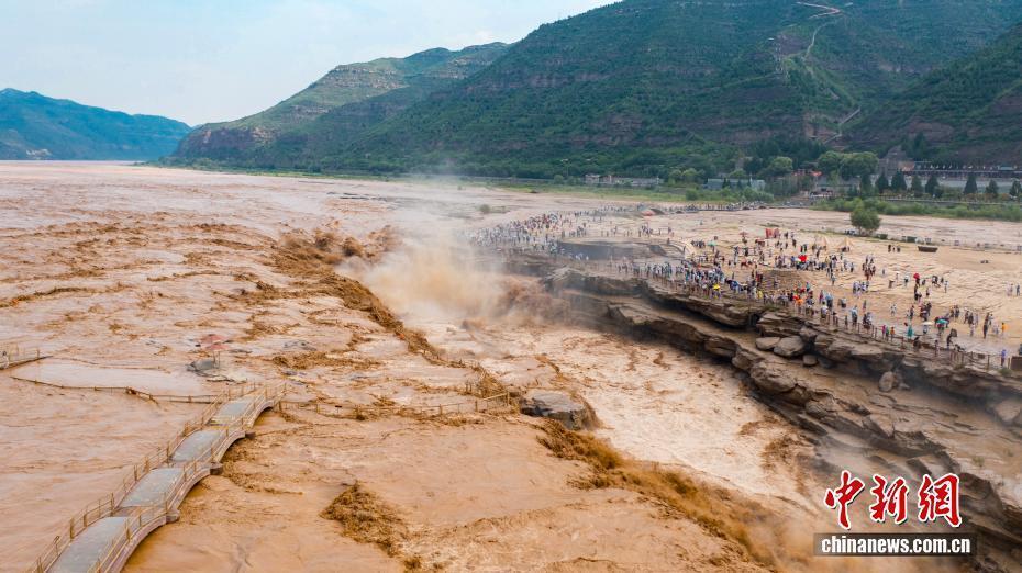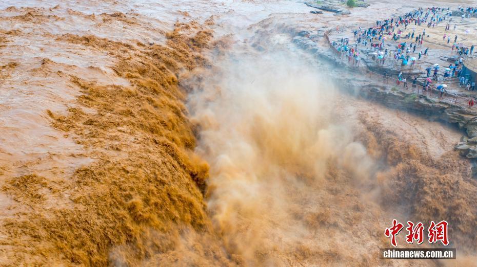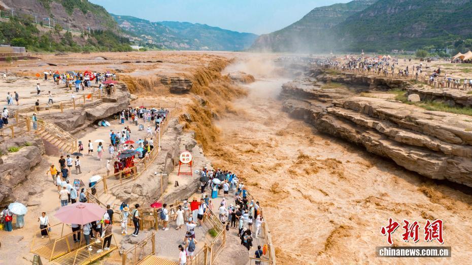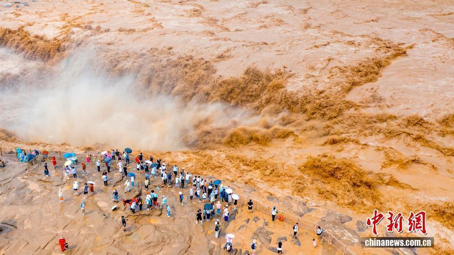 受上游地区降水影响,陕西黄河壶口瀑布近日瞬时水流量骤增,出现双瀑景观。图为黄河壶口瀑布美景吸引了不少游客。霍勇 摄