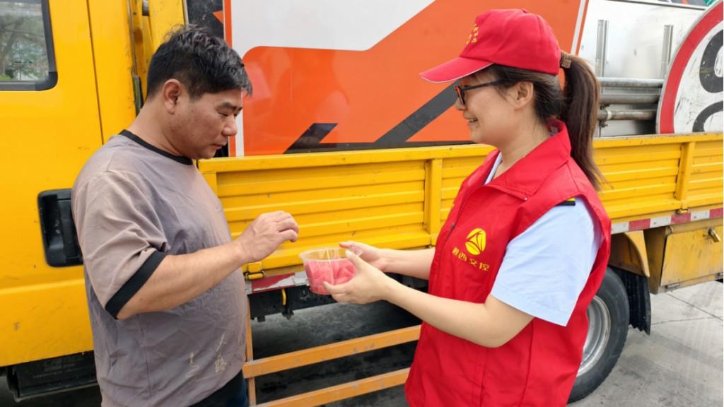 针对酷暑天气,志愿者们精心准备了冰镇矿泉水、解暑西瓜等,热情地分发给过路或短暂停留的货车司机。一杯杯清凉饮品不仅驱散了暑热,更传递了收费站对过往司乘,特别是长途货车驾驶员的诚挚关怀。