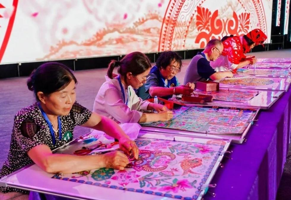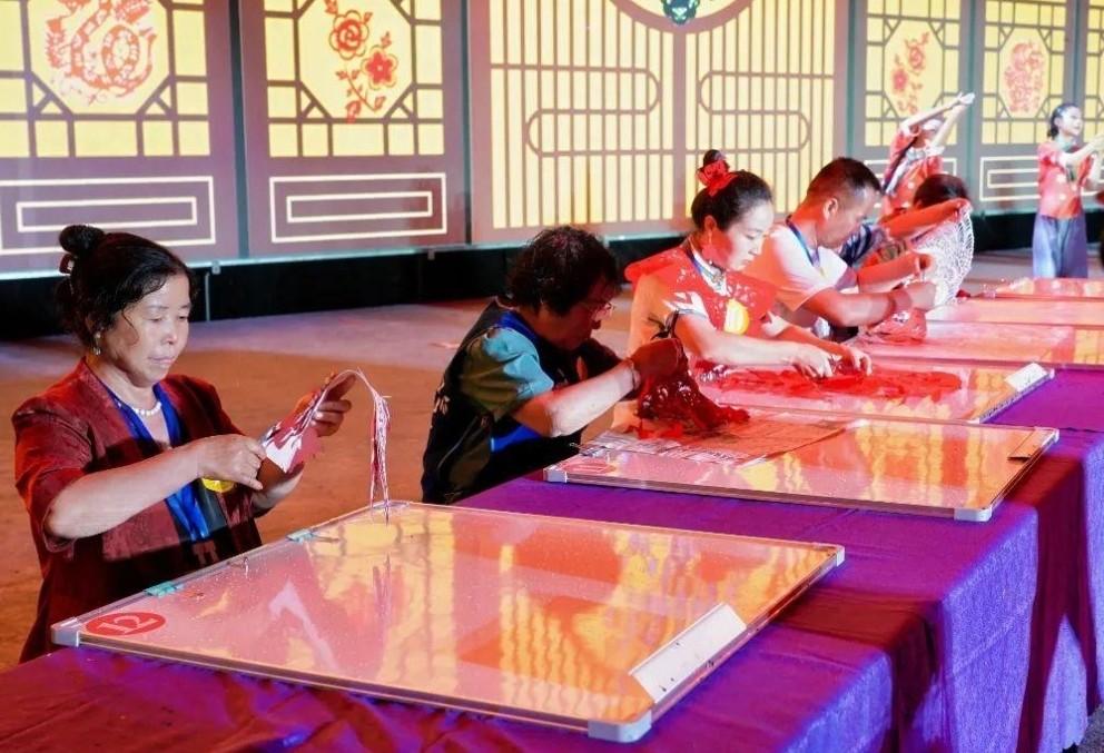 决赛现场,展示环节分四轮展开。其中,第一、二轮为单色组选手的创作展示,第三、四轮则是彩贴组选手的创作比拼。每轮现场创作均设置10分钟创作时长,其间分别穿插了舞蹈《剪花娘子》、歌曲《剪窗花》、舞蹈《空空树》《外婆的剪花》等精彩节目,为紧张的比赛增添了别样的艺术氛围。创作结束后,选手们依次介绍各自作品的立意、主题、手法等,评委现场进行打分。