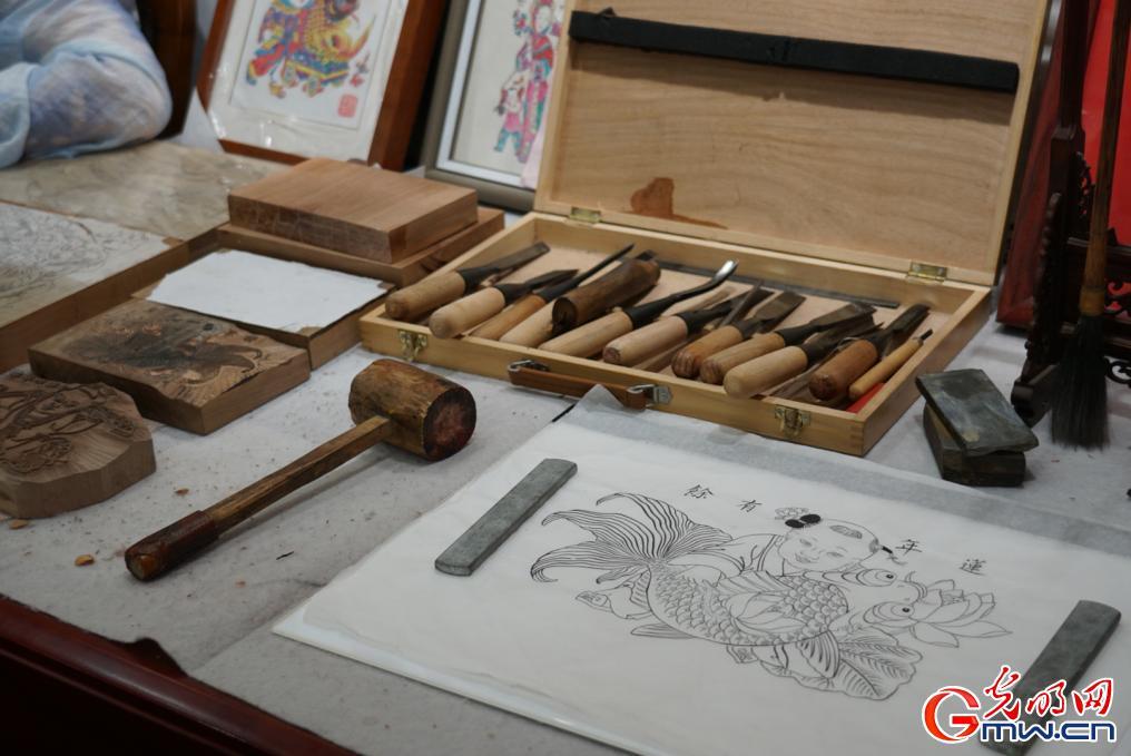 Photo taken on Aug. 7, 2025, shows traditional tools used in making New Year prints on display at the Yuchenghao New Year Print Studio. The meticulous process reflects the skill and care involved in this intangible cultural heritage. (Wang Xinyuan/Guangming Picture)
