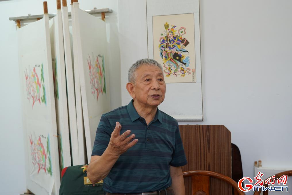 Photo taken on Aug. 7, 2025, shows Huo Qingshun, the sixth inheritor of Yuchenghao New Year Print Studio, being interviewed inside the studio. He is dedicated to preserving and promoting the traditional craft of Yangliuqing new year prints. (Wang Xinyuan/Guangming Picture)