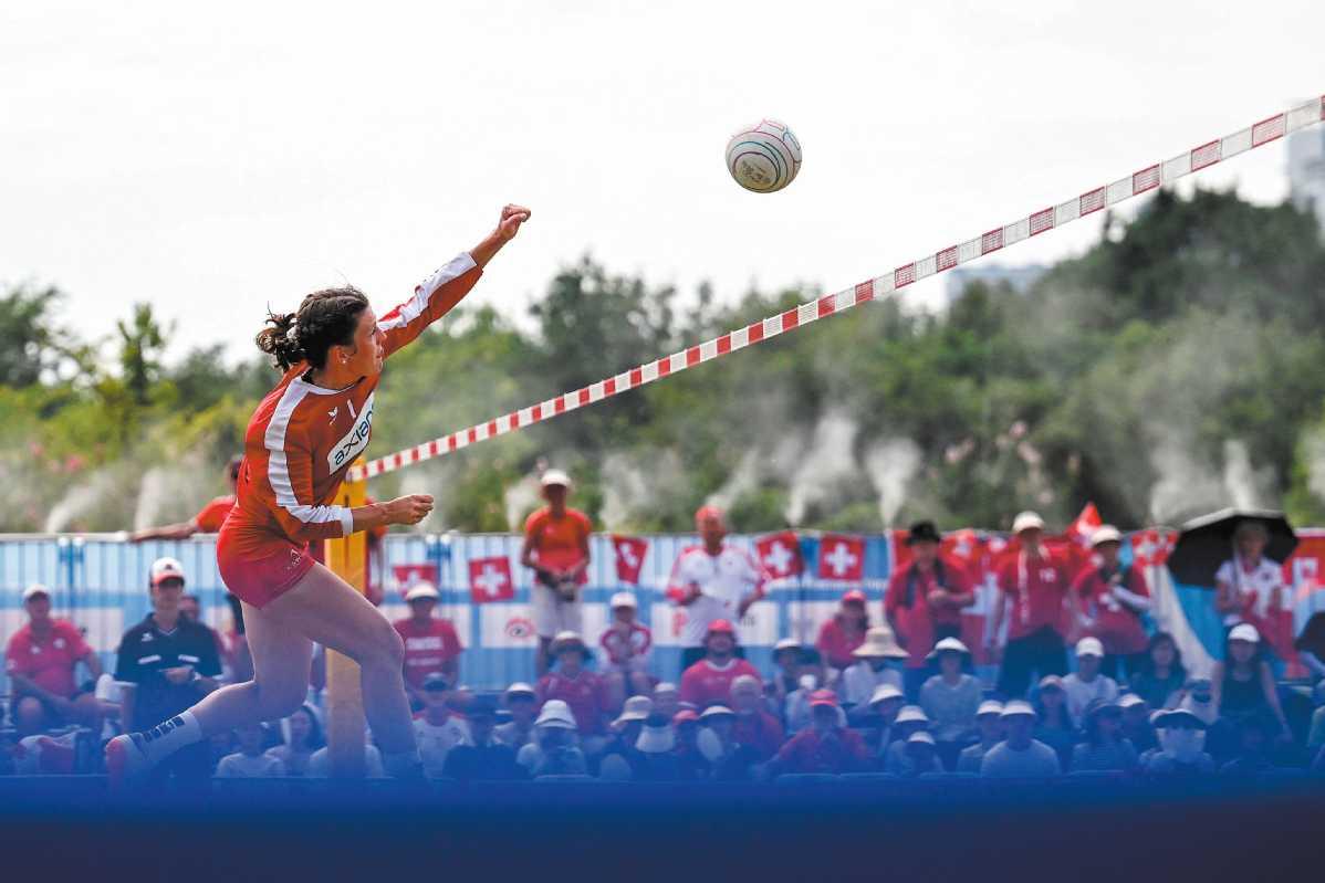 Switzerland's Kim Sprenger returns the ball during the women's fistball final between Brazil and Switzerland at Tianfu Park in Chengdu, Sichuan province, on Wednesday. AFP