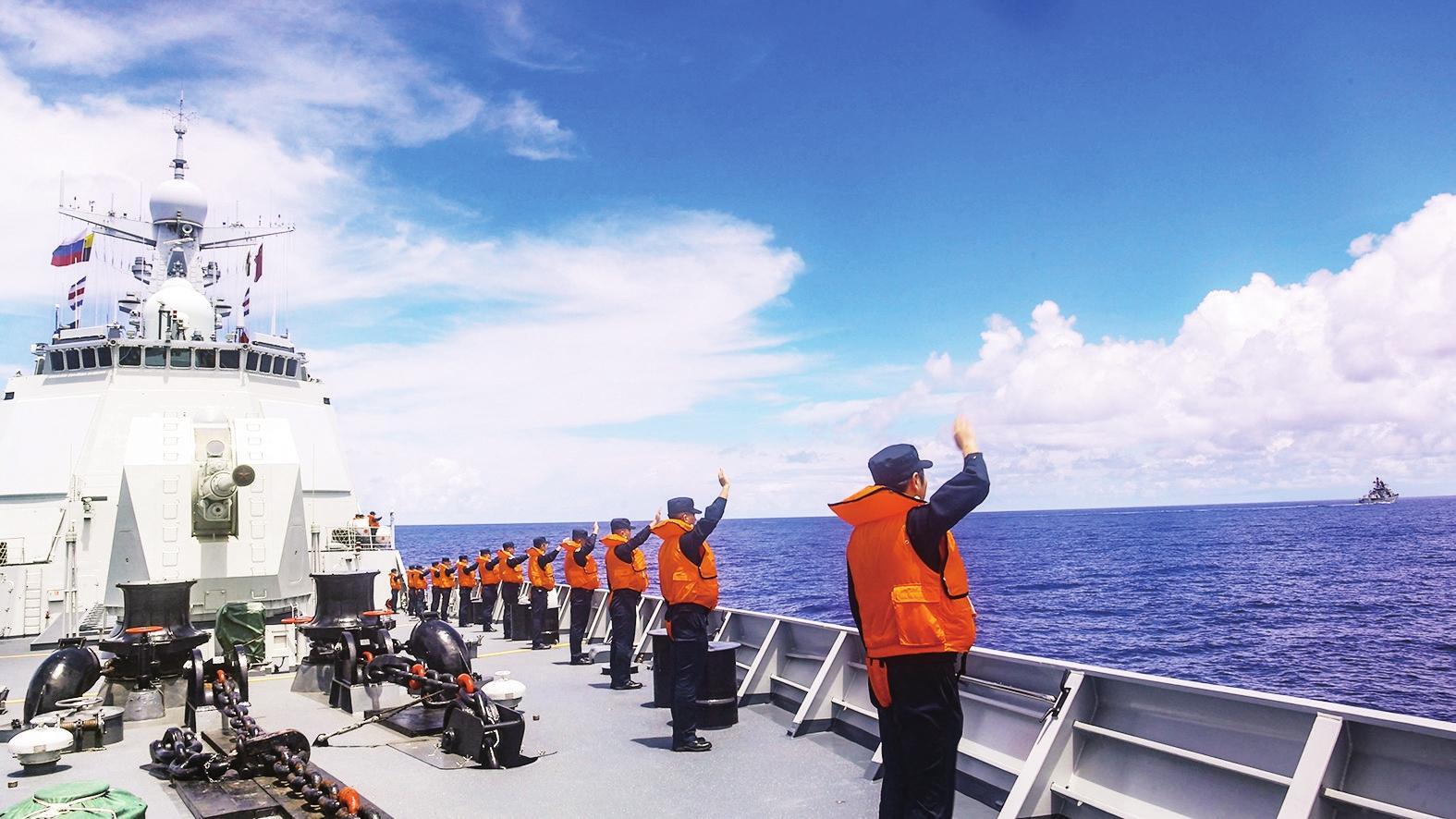 8月20日,中俄海上联合编队在西太平洋某海域举行分航仪式,中方官兵整齐站泊挥手告别。 新华社发(刘龙钦 摄)