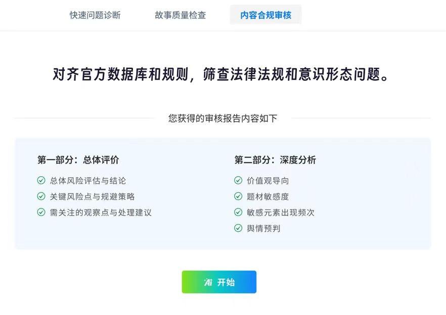 内容合规审核则从宏观角度全面扫描剧本,形成风险评估结论。系统不仅会识别整体风险等级,还会聚焦关键风险点提供针对性规避策略,帮助创作者在保障创作自由的同时降低合规隐患;同时,审核报告将标注需重点关注的细节,并附上可操作的处理建议,为后续打磨提供切实指导。深度分析环节,系统会从四维度细致研判:一是价值观导向,检视剧本传递的价值观是否积极正向;二是题材敏感度,研判题材中涉及的政治、历史、民族、宗教等敏感领域是否存在风险;三是敏感元素频次,追踪敏感元素出现的次数和呈现方式,分析这些内容对观众可能产生的影响;四是舆情预判,结合当下社会舆情特点,提前预判剧本可能引发的争议和舆论反应。