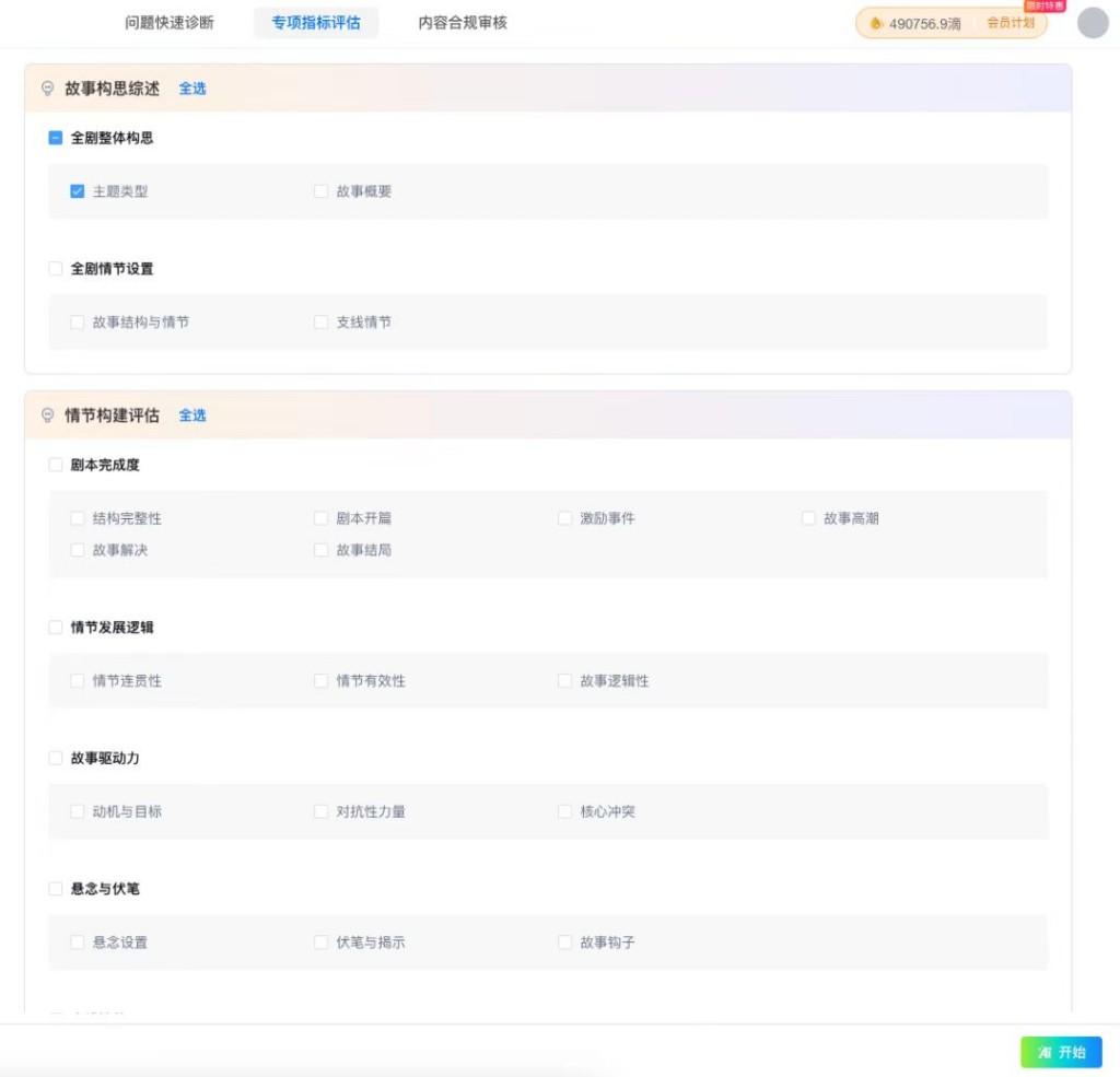 若需精细化评估,“剧本故事质量评估”模块可满足需求。用户围绕故事构思、情节构建、角色塑造、市场价值四大维度,从50+项专业指标中自由勾选,即可定制专属评估方案。系统会生成结构化报告,详细解读单项指标表现并给出分段优化建议,且创作全程可反复调用更新——既保留专业影评人的结构思维,又兼具大数据分析的多维度优势。