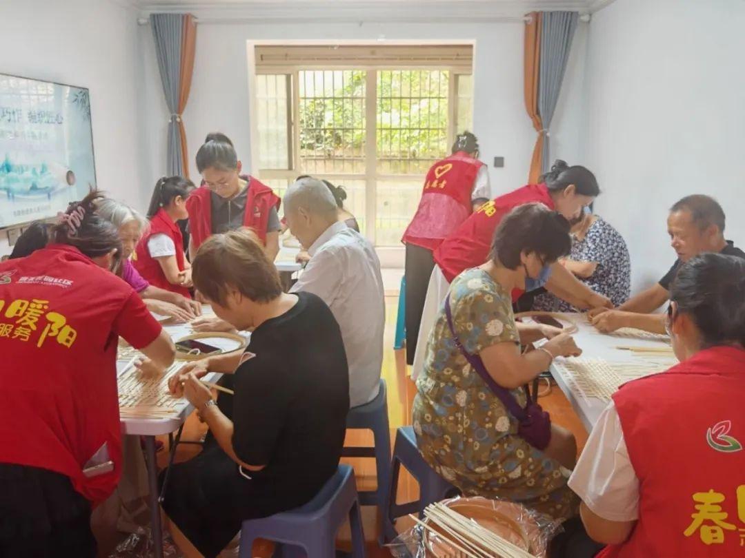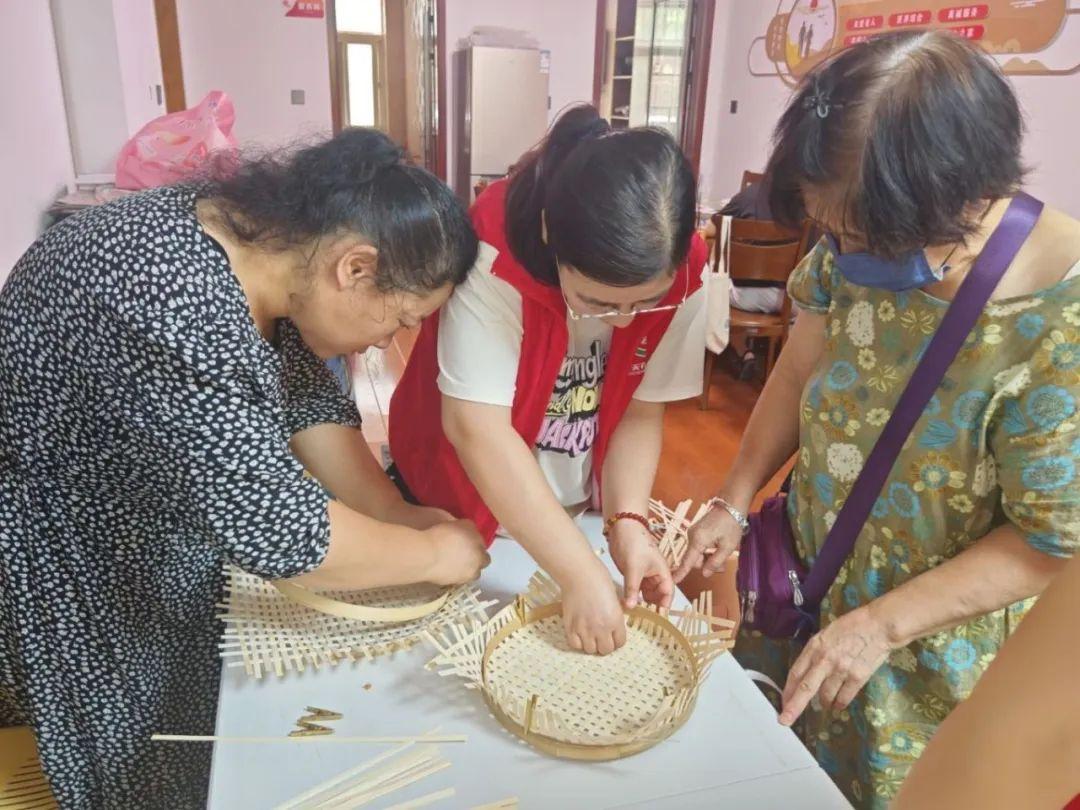活动伊始,社区工作人员化身"非遗讲解员",通过展示精美的竹编成品和原材料,为居民们讲解了竹编工艺的历史渊源与文化内涵。随后,工作人员详细演示了竹篮编织的全过程,从竹篾整理、打结手法到密度控制,每个步骤都耐心指导。“大家先把竹篾固定好,交叉的时候要拉紧,这样编出来的篮子才结实。”工作人员一边示范一边提醒要点。