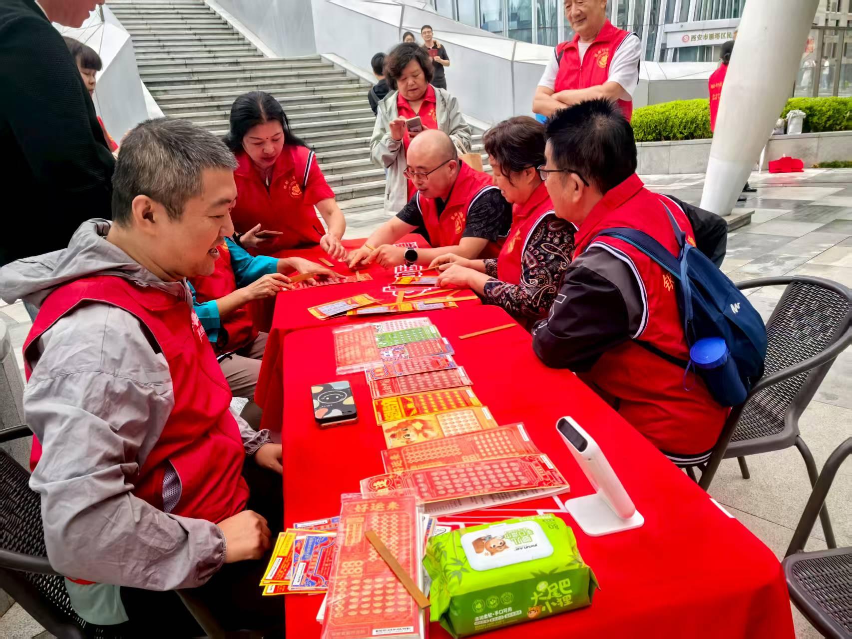 活动现场还原经典古风场景,搭配沉浸式月老牵线、苏轼对诗、许愿灯祈福等互动环节,让新人身感受传统文化的鲜活魅力。结合西安市“银龄行动”,非遗传承志愿者现场解读“同心结”“合欢扇”等传统信物的情感寓意,设置了漆扇绘誓、香囊传情等沉浸式手作体验项目,邀请新人携手制作独属于自己的新婚礼物。现场同时启动了西安市“长安囍事·琴瑟同心”系列婚姻家庭辅导讲堂,为幸福婚姻保驾护航。