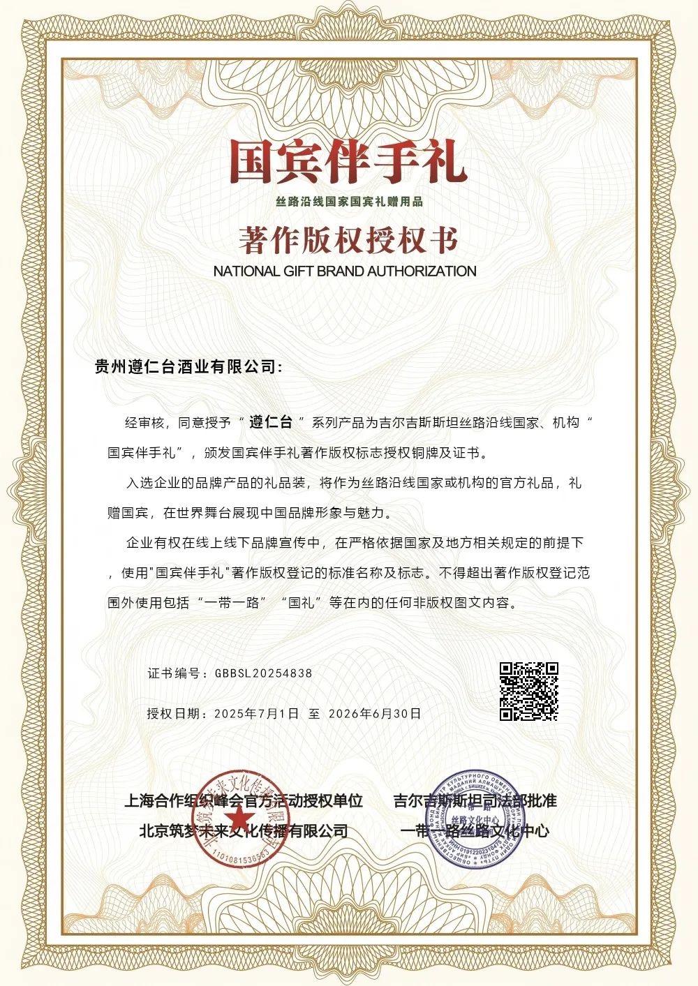 据了解,2025年7月1日,遵仁台·放心酒庄系列产品正式获授“国宾伴手礼”著作版权授权,成为机构国宾伴手礼候选。经严格审核,遵仁台凭借深厚的酿造底蕴与卓越品质,被选定为“国宾伴手礼”。这一荣誉不仅是对遵仁台产品力的高度肯定,也赋予了其在国际交流中传递中国品质和文化的重要使命。