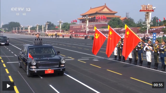 伟大旗帜光耀千秋。中国共产党党旗、中华人民共和国国旗、中国人民解放军军旗在受阅部队最前方迎风招展。检阅车行进至党旗、国旗、军旗前,敬礼号角响起,习近平停车肃立,以注目礼向三面旗帜庄严致敬。