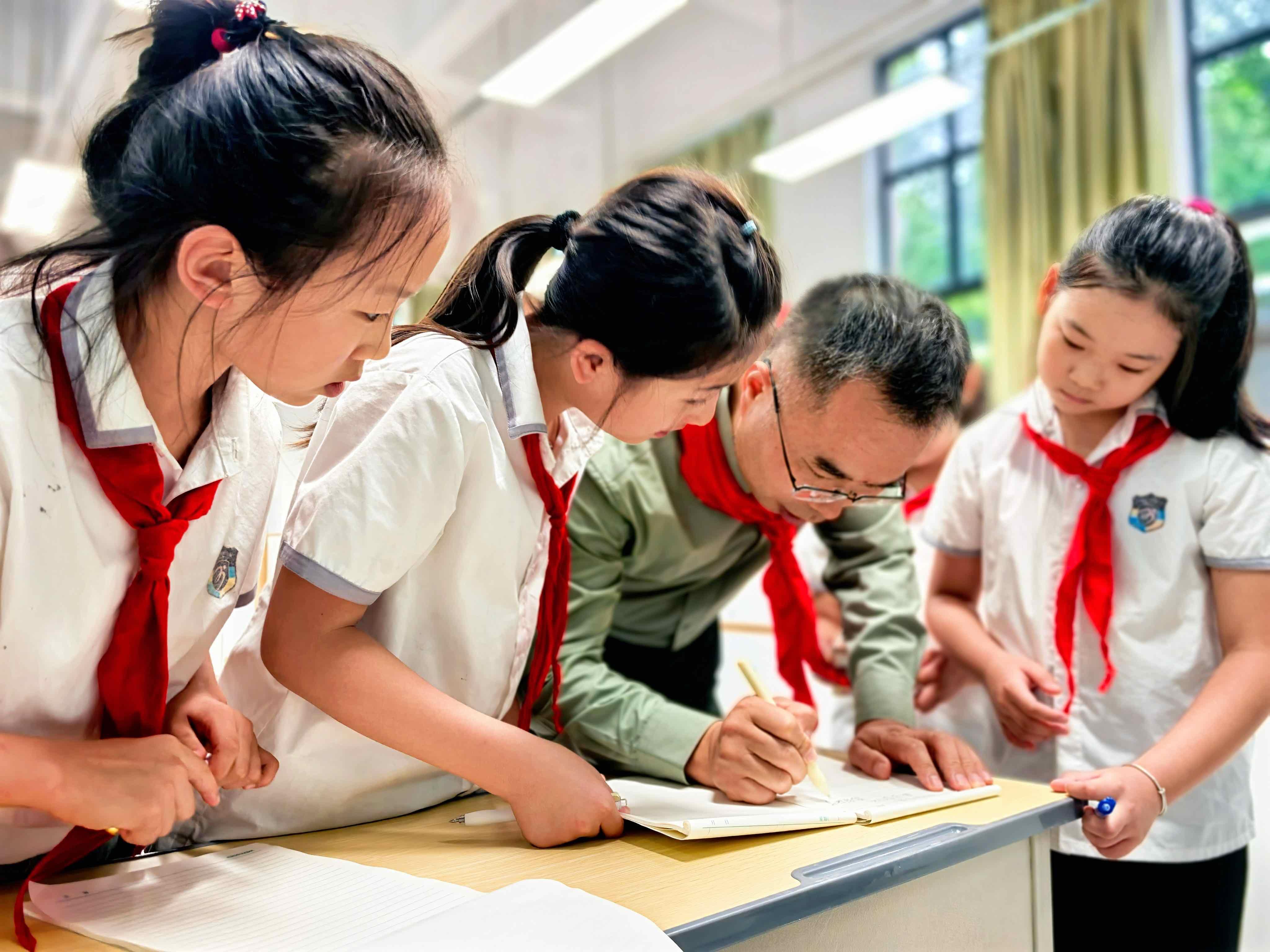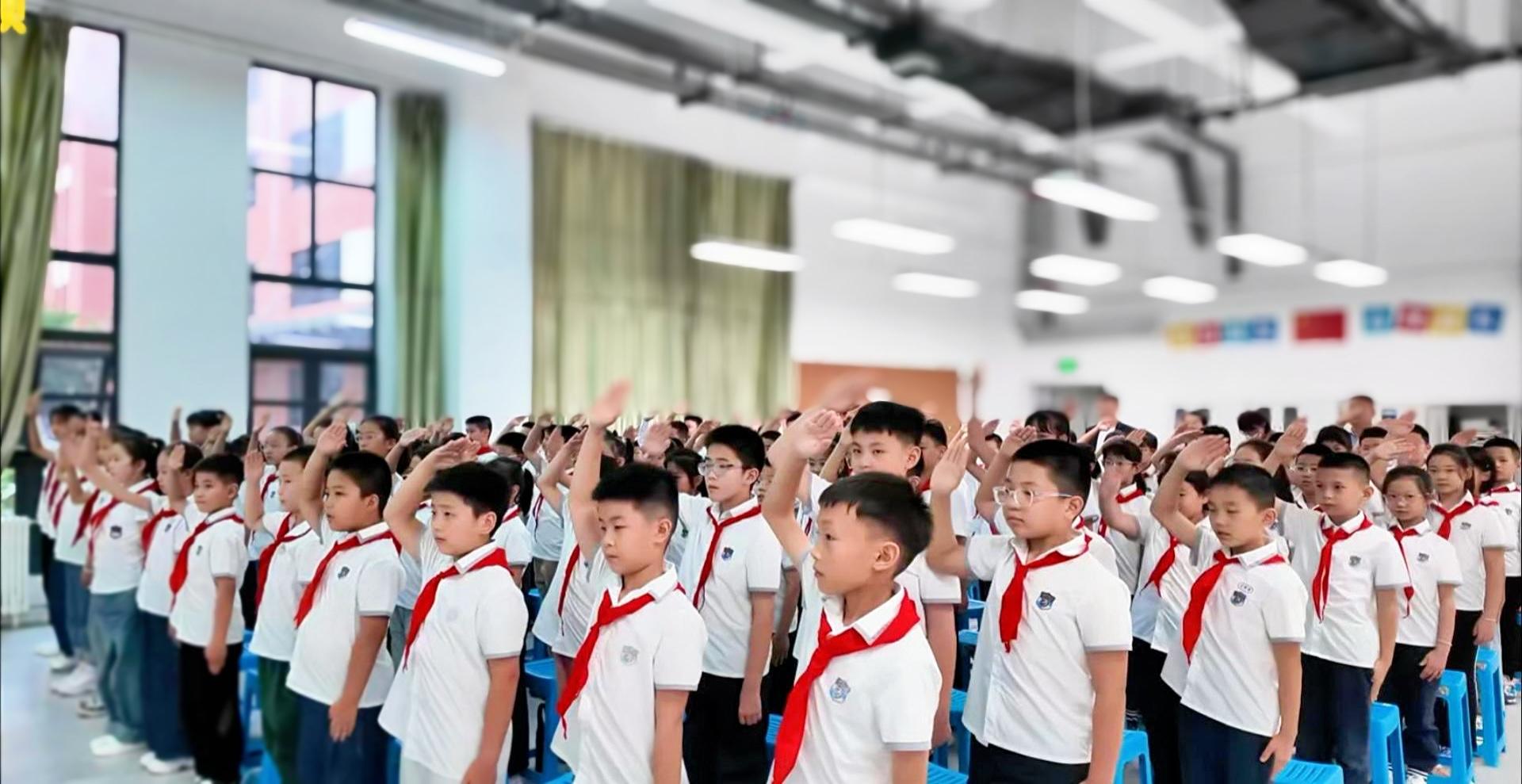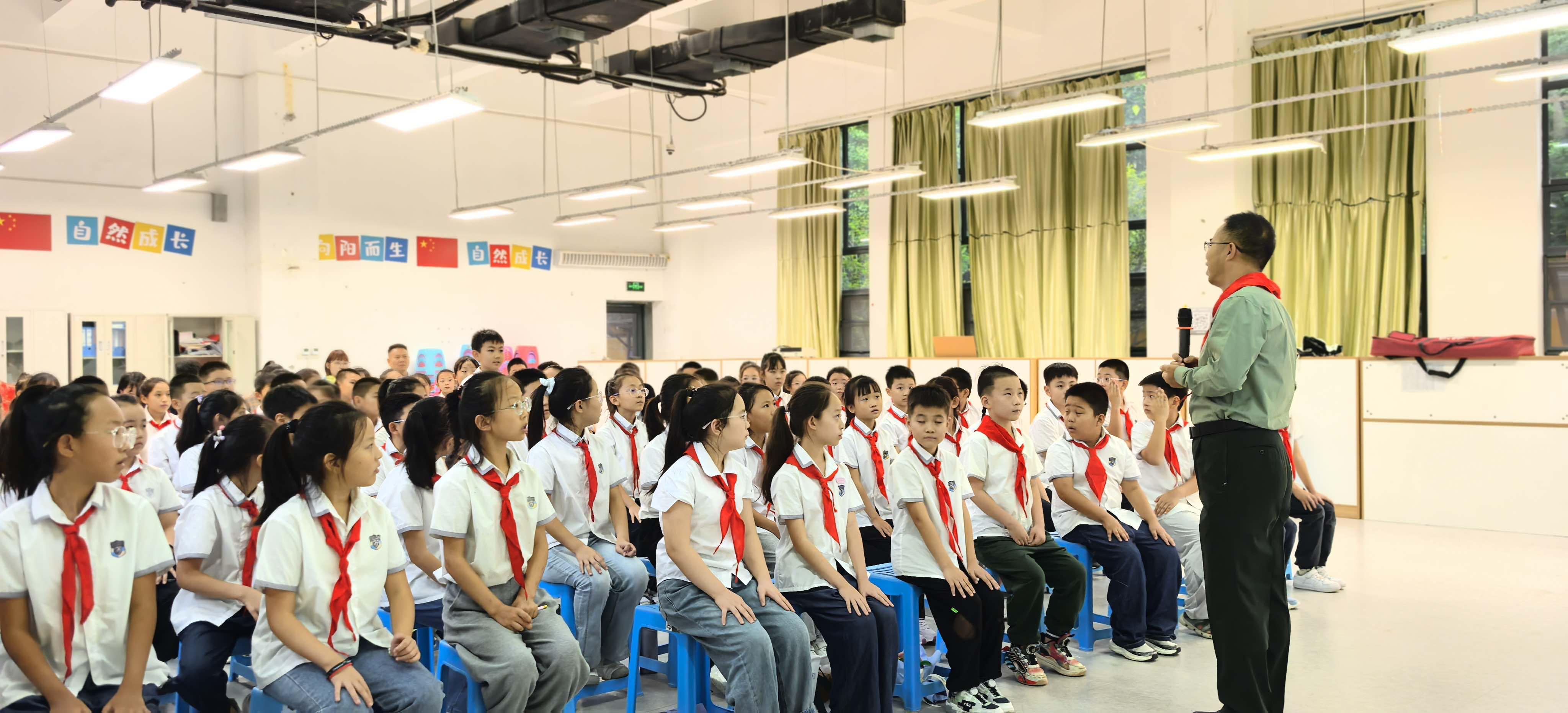 课程在同学们高亢嘹亮的《中国少年先锋队队歌》声中拉开序幕。杨银科并未直接讲述宏大的历史,而是巧妙地以孩子们刚刚结束的暑假生活为切入点,开启了与同学们的互动。“暑假里,有哪些同学去了有意义的地方,愿意和大家分享?”问题一出,立刻点燃了现场的气氛,孩子们争先恐后地举手回答。