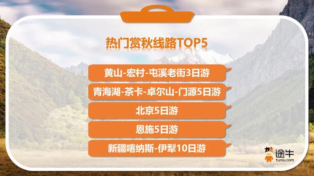 热门赏秋线路方面,“黄山-宏村-屯溪老街3日游”“青海湖-茶卡-卓尔山-门源5日游”“北京5日游”“恩施5日游”“新疆喀纳斯-伊犁10日游”等跟团游产品成为途牛用户的热门之选。