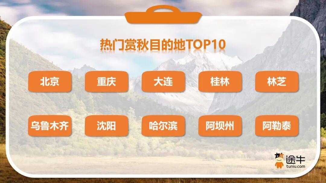 途牛截至目前最新预订数据显示,错峰赏秋热潮即将在东北、华北、西北、西南等方向率先开启。其中,北京、重庆、大连、桂林、林芝、乌鲁木齐、沈阳、哈尔滨、阿坝州、阿勒泰等目的地更受赏秋游用户青睐。