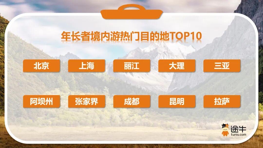 境内游热门目的地中,北京、上海、丽江、大理、三亚、阿坝州、张家界、成都、昆明、拉萨等成为年长者更热门的选择。