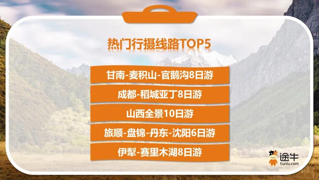 在赏秋热潮的推动下,行摄、徒步、骑行、露营、旅拍等相关主题的旅游产品热度高涨。行摄主题方面,“甘南-麦积山-官鹅沟8日游”“成都-稻城亚丁8日游”“山西全景10日游”“旅顺-盘锦-丹东-沈阳6日游”“伊犁-赛里木湖8日游”等跟团游产品成为途牛赏秋游及摄影爱好者的热门选择。