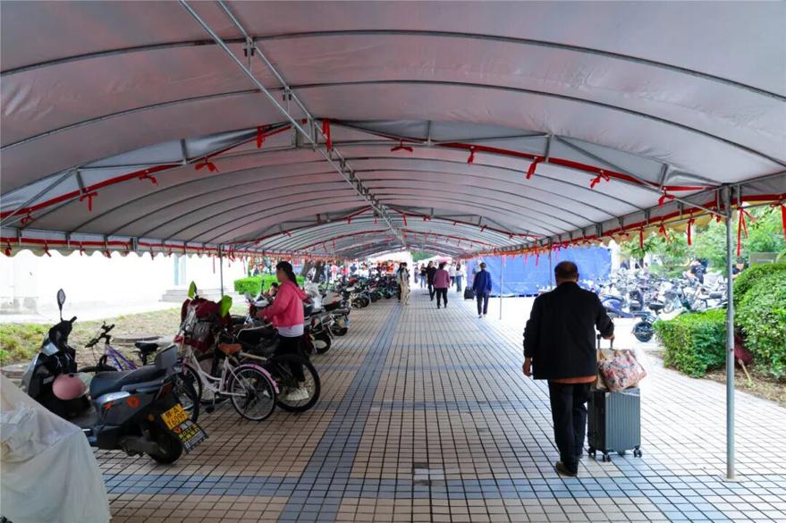 今年该校迎新恰逢秋雨连绵,学校提前搭建了300米的遮雨长廊,从迎新点一直延伸到6、7号以及3号公寓,为新生和家长筑起了温暖的避雨港湾。在体育馆内的家长休息区,更是暖意融融,家长们可以坐在这里喝着姜汤茶小憩。“从老家坐了8个小时火车,本来挺累的,在这里歇歇脚,喝口热水,心里暖暖的。”一位家长说。