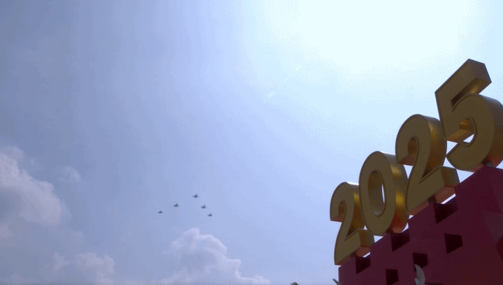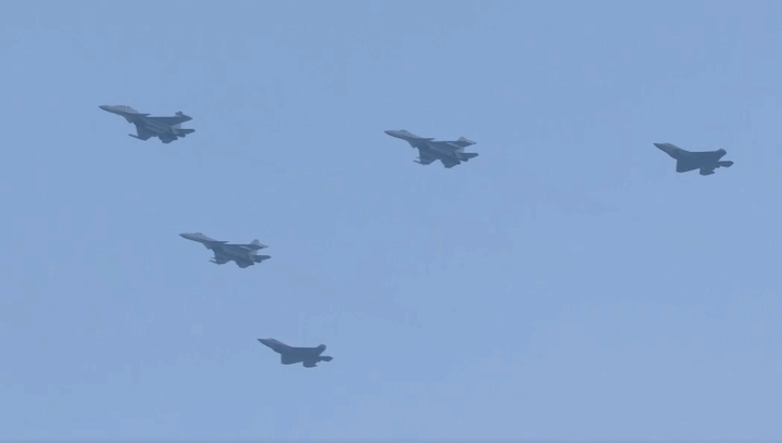 航母佩剑,刀尖舞者,歼-15DH、歼-15DT、歼-35和歼-15T编成两个楔队接受检阅,从滑跃起飞到弹射出击,从单一机型到多机协同,中国舰载机跨越发展,搏击海空。