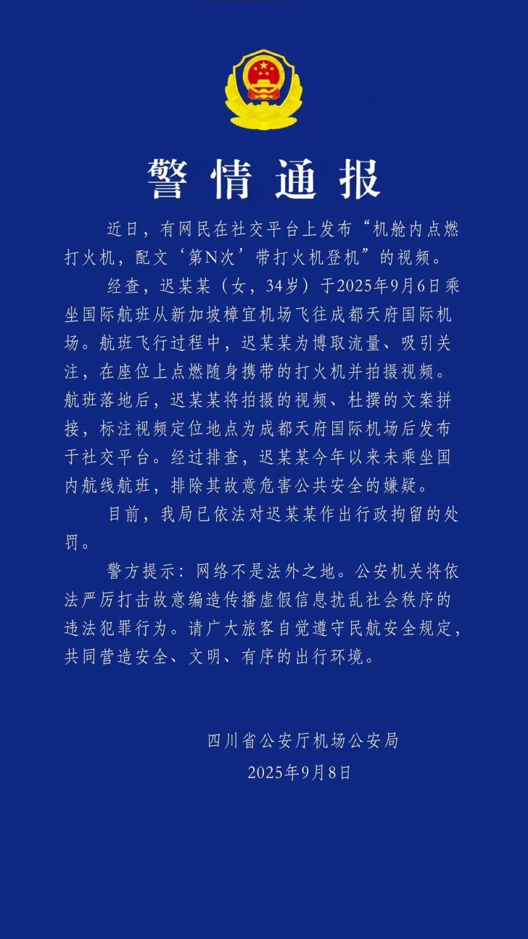 9月8日下午,“四川机场公安”微信公号发布一则警情通报: