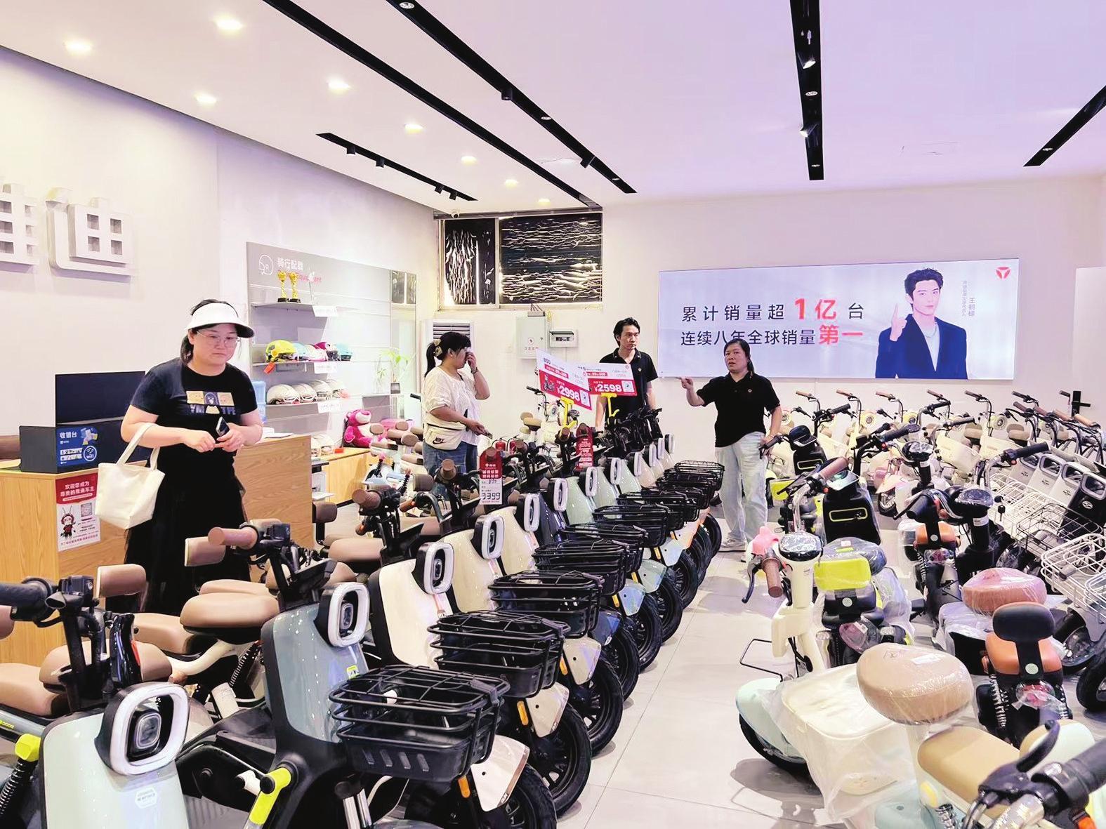 在过渡期,商家纷纷加大促销力度。有品牌商家在展厅挂出“全年最低价”标语。伞塔路靠近路北口的一家品牌店,展厅里电动自行车和电动摩托车分区摆放,导购正忙着为市民介绍车型。