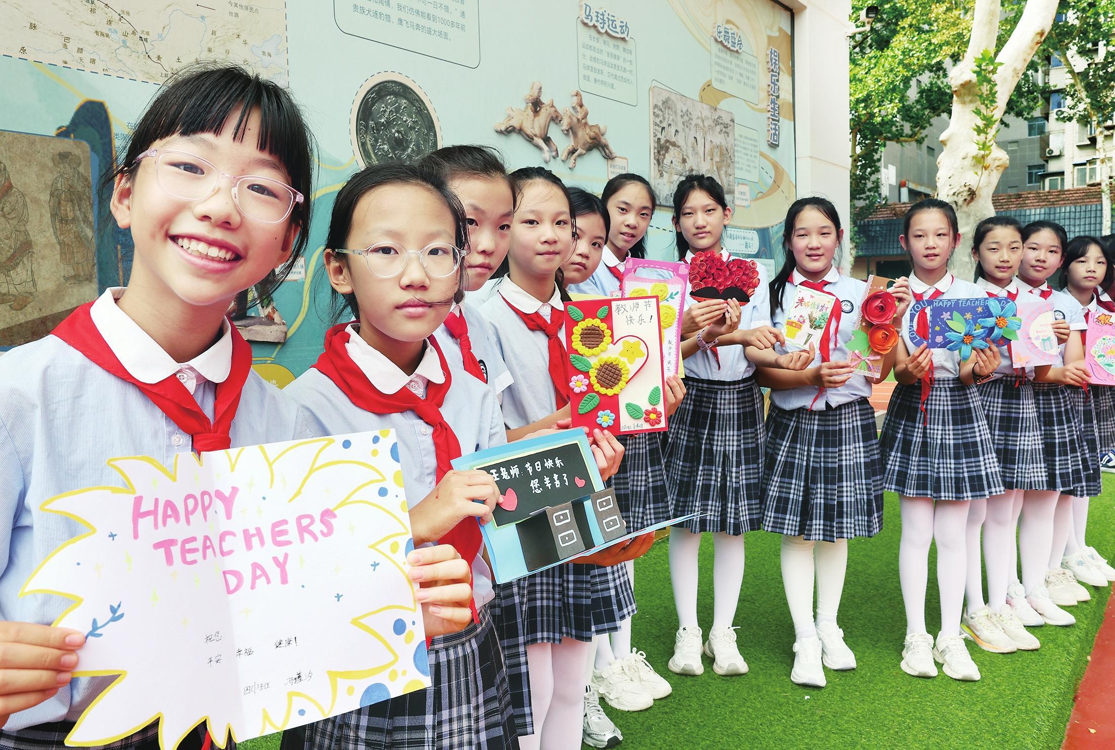 9月9日下午,西安市碑林区南门小学联合汉景帝阳陵博物院举办“开笔启智承文脉,强师铸魂谱华章”一年级“开笔礼”暨教师节庆祝活动。新生通过正衣冠、朱砂启智等传统仪式,沉浸式体验中华传统文化。随后,四年级学生向老师赠送自制手工作品,表达节日祝福。图为四年级学生展示手工作品。