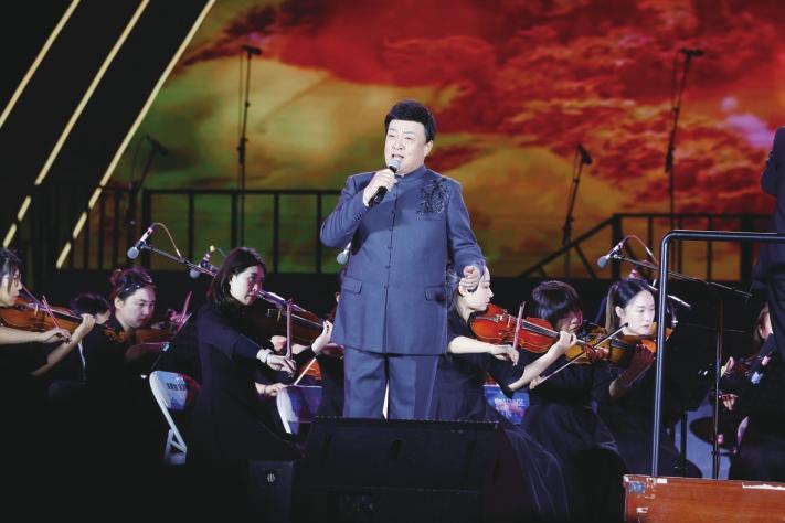 陕北民歌歌王王向荣的一声清唱,宛如天籁之音,穿透夜空。管弦乐《红旗颂》缓缓奏响,让观众感受到神州大地跃动着的蓬勃生机。《黄河船夫曲》前奏响起时,全体合唱团成员和交响乐团以铿锵有力的节奏和富有张力的表演,展现出陕北民歌与交响乐融合所产生的震撼力量。