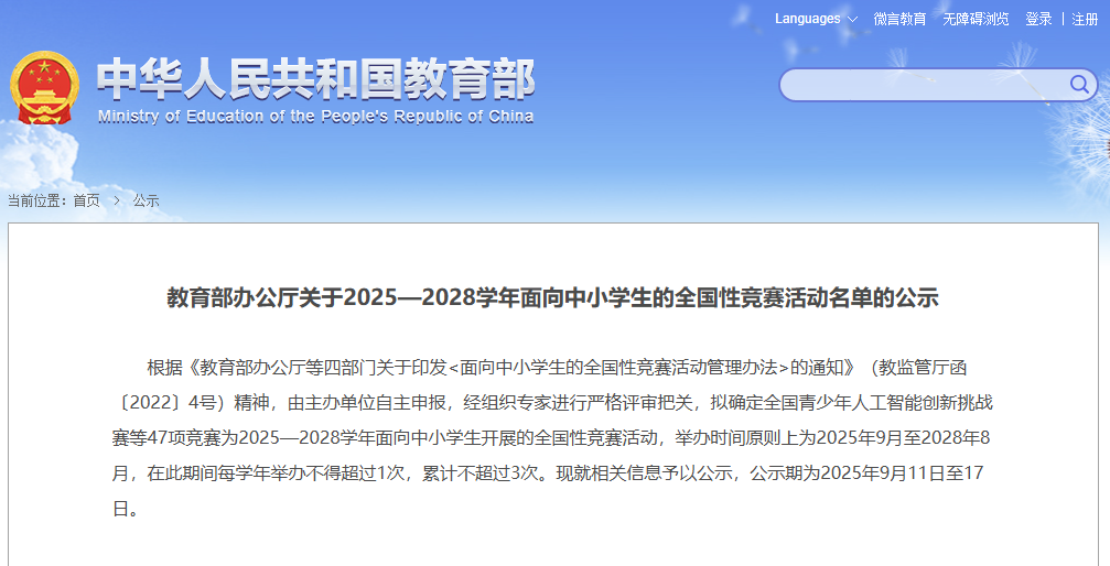 根据《教育部办公厅等四部门关于印发<面向中小学生的全国性竞赛活动管理办法>的通知》(教监管厅函〔2022〕4号)精神,由主办单位自主申报,经组织专家进行严格评审把关,拟确定全国青少年人工智能创新挑战赛等47项竞赛为2025—2028学年面向中小学生开展的全国性竞赛活动,举办时间原则上为2025年9月至2028年8月,在此期间每学年举办不得超过1次,累计不超过3次。现就相关信息予以公示,公示期为2025年9月11日至17日。