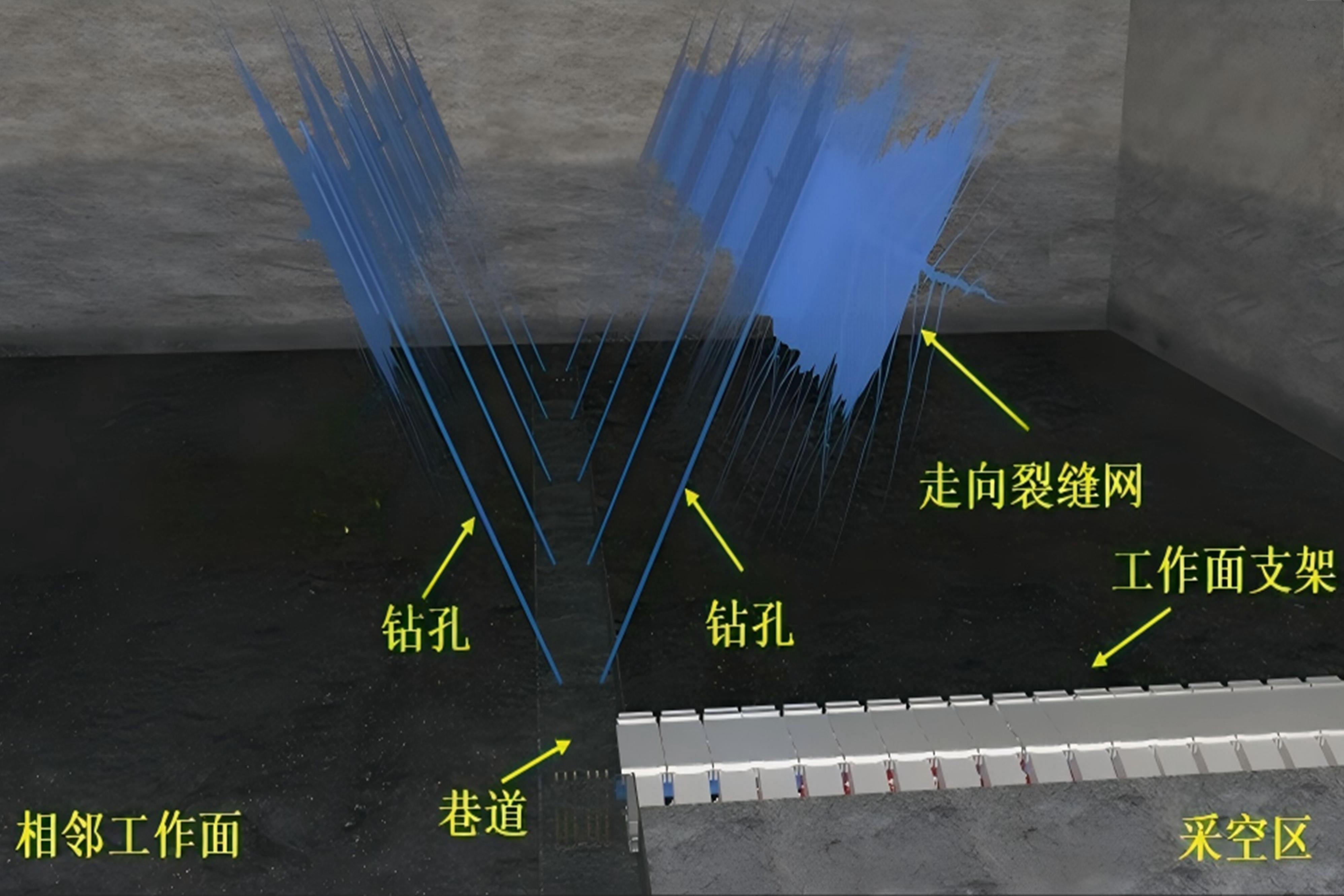该技术依托“钻孔钻进-控向加砂-短孔压裂”三道工序,通过在顶板主控岩层精准布置钻孔后,借助射孔角度监测系统实时调整钻孔方向,同步使用高压水流输送金刚砂完成射孔作业,利用高压泵分段实施压裂,且钻孔设定深度为41~47米、倾角为65°-75°,喷孔方位角精准控制在90°/270°,单孔分3段压裂,让压力稳定在15-20MPa,确保裂缝完全按设计路径延展。经现场实测,压裂后的顶板成功形成有效预制切落面,观测孔出现持续出水现象,裂缝宽度达4~6毫米,不仅有效消除一氧化碳超限风险,冲击地压隐患发生率也大幅降低。