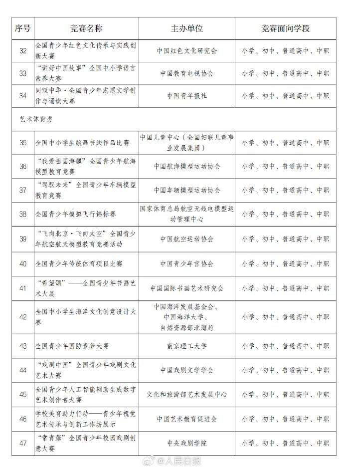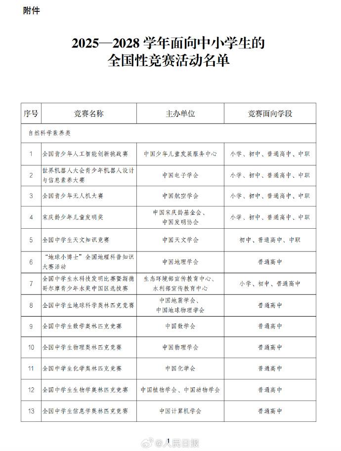 近日,教育部官网公示了《2025—2028学年面向中小学生的全国性竞赛活动名单》,共47项竞赛。举办时间原则上为2025年9月至2028年8月,在此期间每学年举办不得超过1次,累计不超过3次。