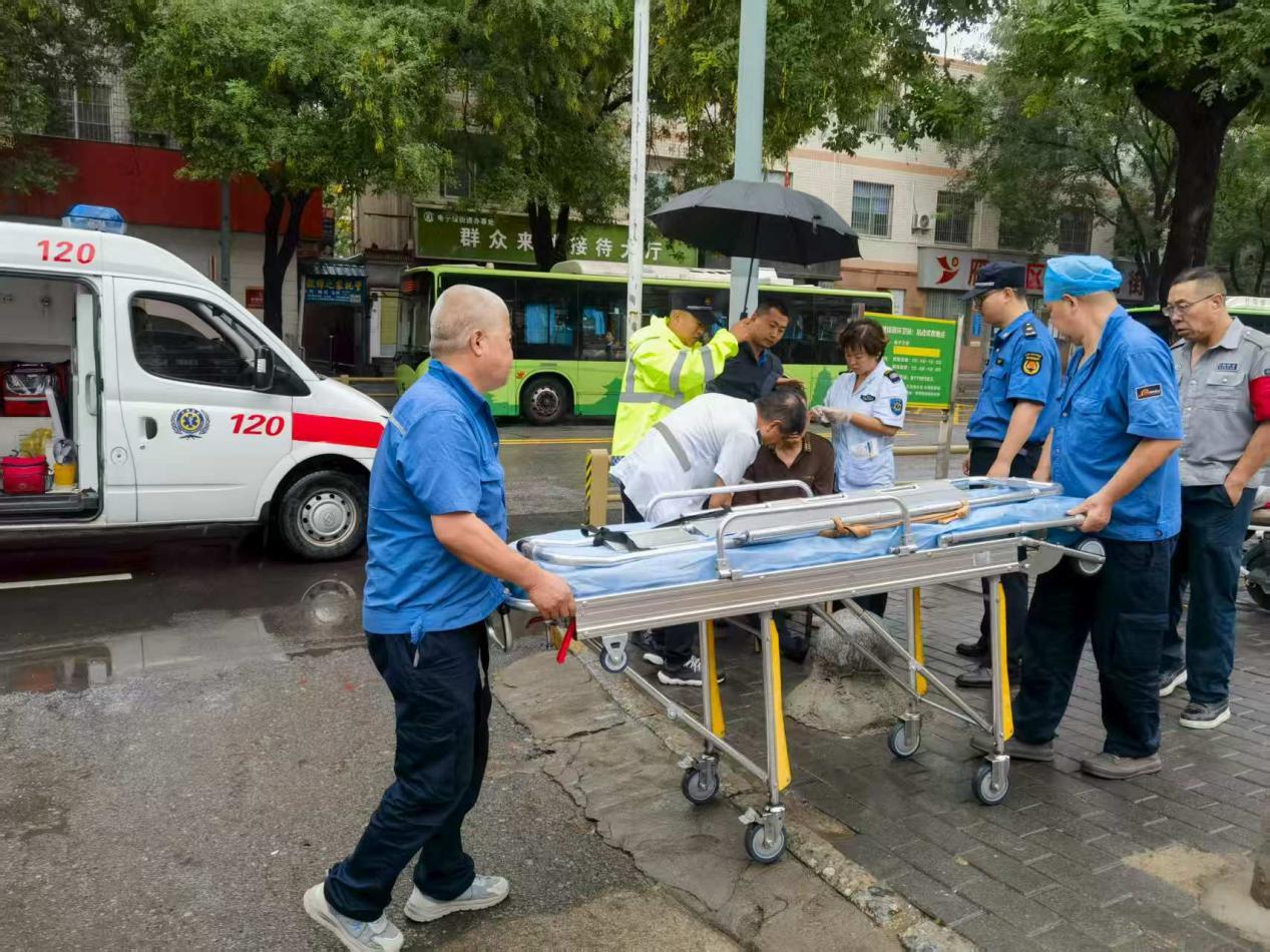 不久后,120急救车抵达现场。为保障医护人员顺利开展急救,队员们始终撑着雨伞为老人遮雨,配合医生完成雨天现场初步检查与简单包扎。随后,队员们协助医护人员将老人平稳抬上急救车,转运至附近的兵器工业集团总医院(521医院)接受进一步治疗。在队员与周边群众的高效协作下,老人最终得到及时救助,现场交通也快速恢复正常。