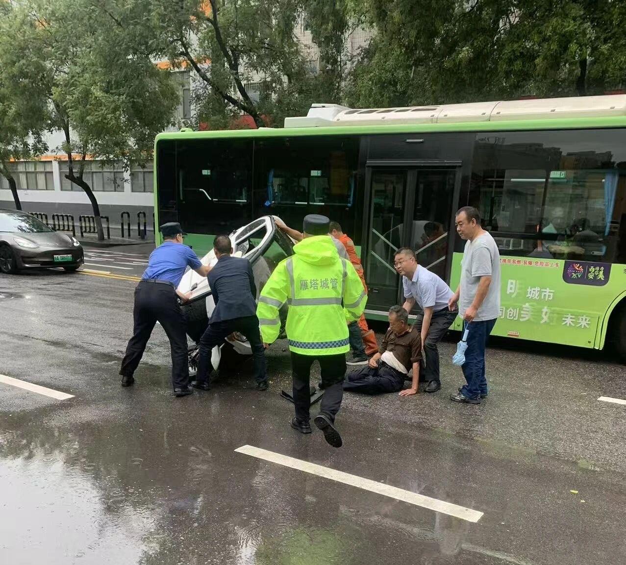 三秦都市报-三秦网讯(记者 赵丽莉)9月11日15时许,西安市雁塔区突降大雨,雁塔区城管执法局电子城中队队员韩超、徐翌辰、汤嘉祥等人正冒雨在辖区开展迎检整治工作。当巡查至电子正街电子城小学门前时,队员们突然发现快车道中间,一位驾驶“老头乐”老年代步车的老人不慎侧翻,身体摔倒在正常行进的公交车旁,情况十分危急。