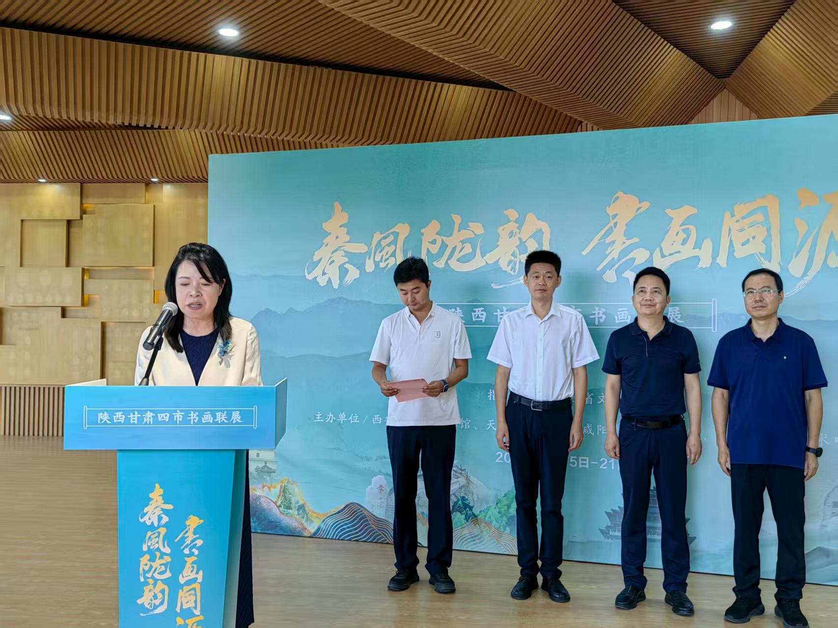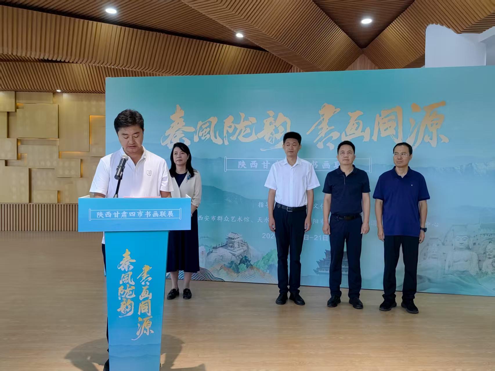 陕西省文化馆副馆长赵耀、美术部副主任张修安,西安市群众艺术馆党支部书记、馆长白利群,天水市文化馆党支部书记、馆长李臻,咸阳市群众艺术馆党支部书记、馆长李军,渭南市文化艺术中心党总支书记、主任田建,以及来自四地的书画艺术家和文化工作者共同出席开幕式。陕西省文化馆副馆长赵耀宣布展览开幕。西安市群众艺术馆党支部书记、馆长白利群,天水市文化馆党支部书记、馆长李臻分别致辞。