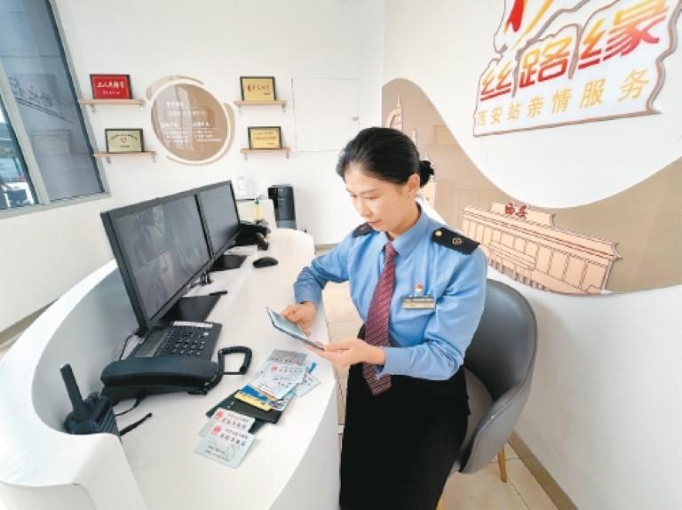“丝路缘”服务亭工作人员正在查看捡到的证件