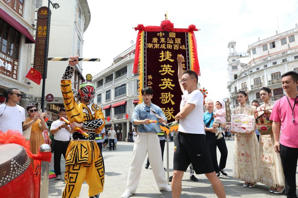 9月15日上午10点,张朝阳的潮汕文化之旅从汕头历史文化地标“小公园”开启。中山纪念亭旁,一支英歌队上演气势磅礴的表演,源自《水浒传》的刚劲舞姿吸引了张朝阳的目光。他全程沉浸观看,还向队员学习转槌动作,亲身体验这一非遗代表性项目的豪迈活力。