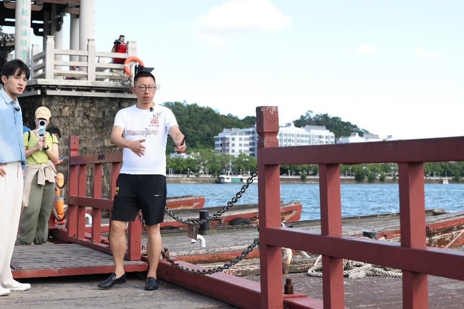 告别汕头后,张朝阳转赴潮州,探寻千年古城的文化底蕴。抵达“中国四大古桥之一”的广济桥东门时,他被韩江江景与桥体建筑吸引,“这个江的宽度刚好,有水则灵,江风一吹很舒服。”